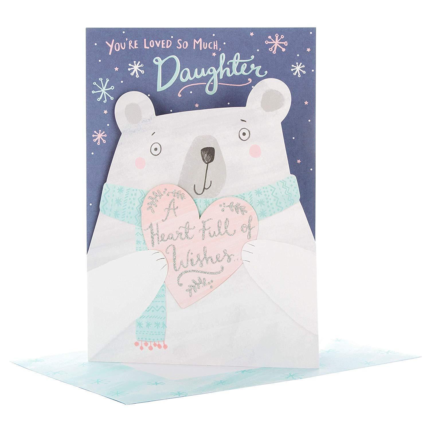 This Daughter Christmas card is printed on quality glittered card and includes a removable heart card for your own secret message. Royal Mail Postage: Standard Letter Size. Envelope Colour: Blue Patterned. Dimensions: H 22.8cm x W 15.9cm x D 0.2cm. FSC Accredited: Paper from responsible sources.
