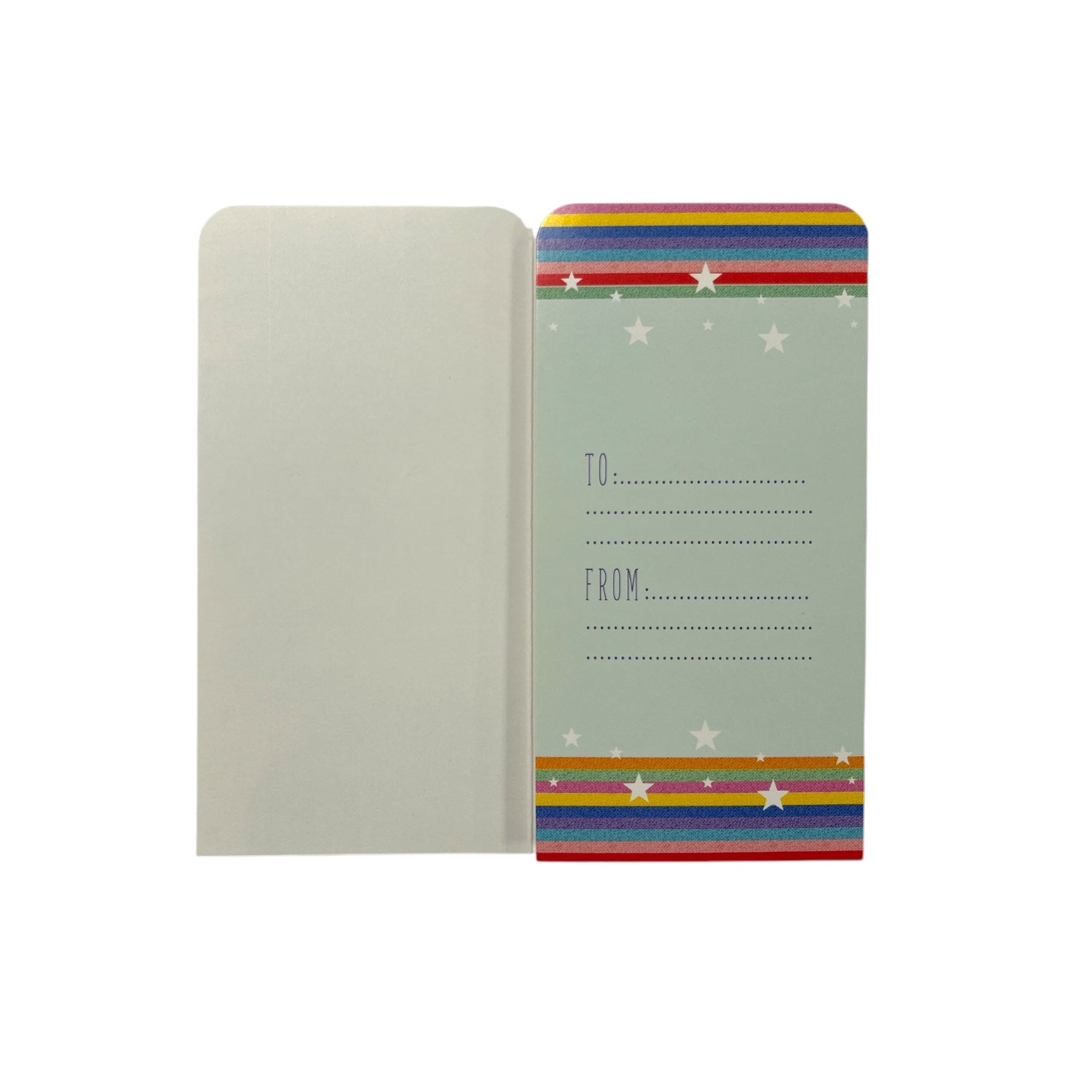 Make your grandson's Easter celebration extra special with this delightful money wallet card. Featuring a charming design of colourful Easter eggs adorned with vibrant stripes, chevrons, and geometric patterns, this card creates a festive atmosphere perfect for the spring holiday. The playful artwork includes adorable bunnies hopping amongst golden stars, whilst cheerful bumble bees add a whimsical touch to the scene. The card's message 'FOR A DEAR GRANDSON At EASTER' is beautifully presented in eye-catching metallic gold and multicoloured lettering. This money wallet design offers a practical way to give a monetary gift whilst showing your love and thoughtfulness. The cheerful colour palette and fun illustrations make this card a delightful keepsake that's sure to bring a smile to your grandson's face this Easter season. Ideal for tucking in some spending money or a gift card to make the holiday even more memorable. Approx Size: Closed: 91 x 177mm, Open (3 fold): 270 x 177mm.