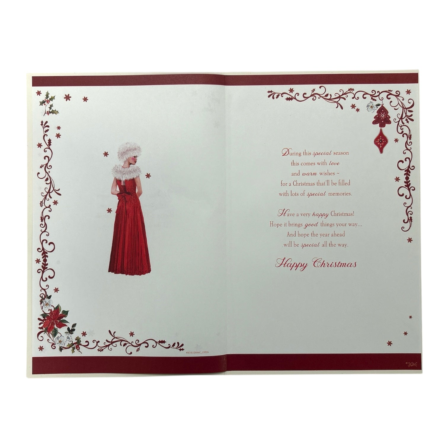 For a Special Daughter and Family Christmas Card. Send festive cheer to your daughter and her family with this beautifully designed Christmas card. The heartwarming scene features a woman arranging decorations beside a glowing fireplace, surrounded by gifts, a Christmas tree, and seasonal ornaments. A sparkling red border frames the image, adding a touch of festive elegance. With its rich colors and cozy details, this card perfectly captures the warmth and joy of holiday celebrations. Approx. size 275 x 175mm, supplied with a coordinating envelope.