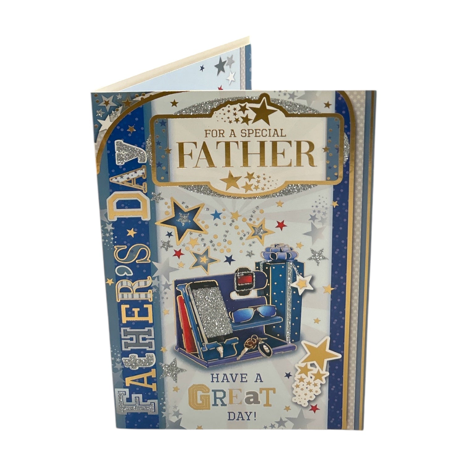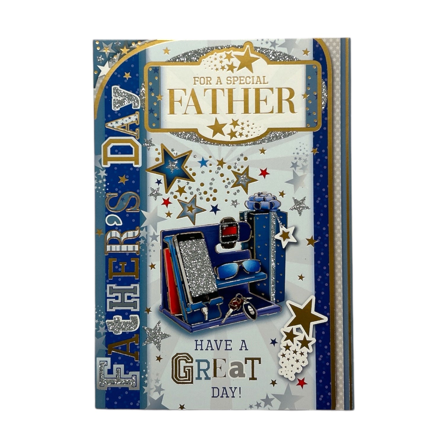 Celebrate Father’s Day with this stylish and sophisticated card. The front features a collection of elegant men's accessories, including a cellphone, keys, watch, perfume bottle, and glasses, all carefully arranged to symbolize the refined taste and personality of the special man in your life. The design is elevated with foil details and embossed elements, giving it a premium feel. Foil details and embossed elements add texture and elegance, while the glitter-finished bursts of stars bring a touch of sparkle and charm. Inside, a heartfelt Father’s Day message expresses your love and appreciation. This card comes with a coordinating envelope. Card Size: Approx. 27 x 18 cm.