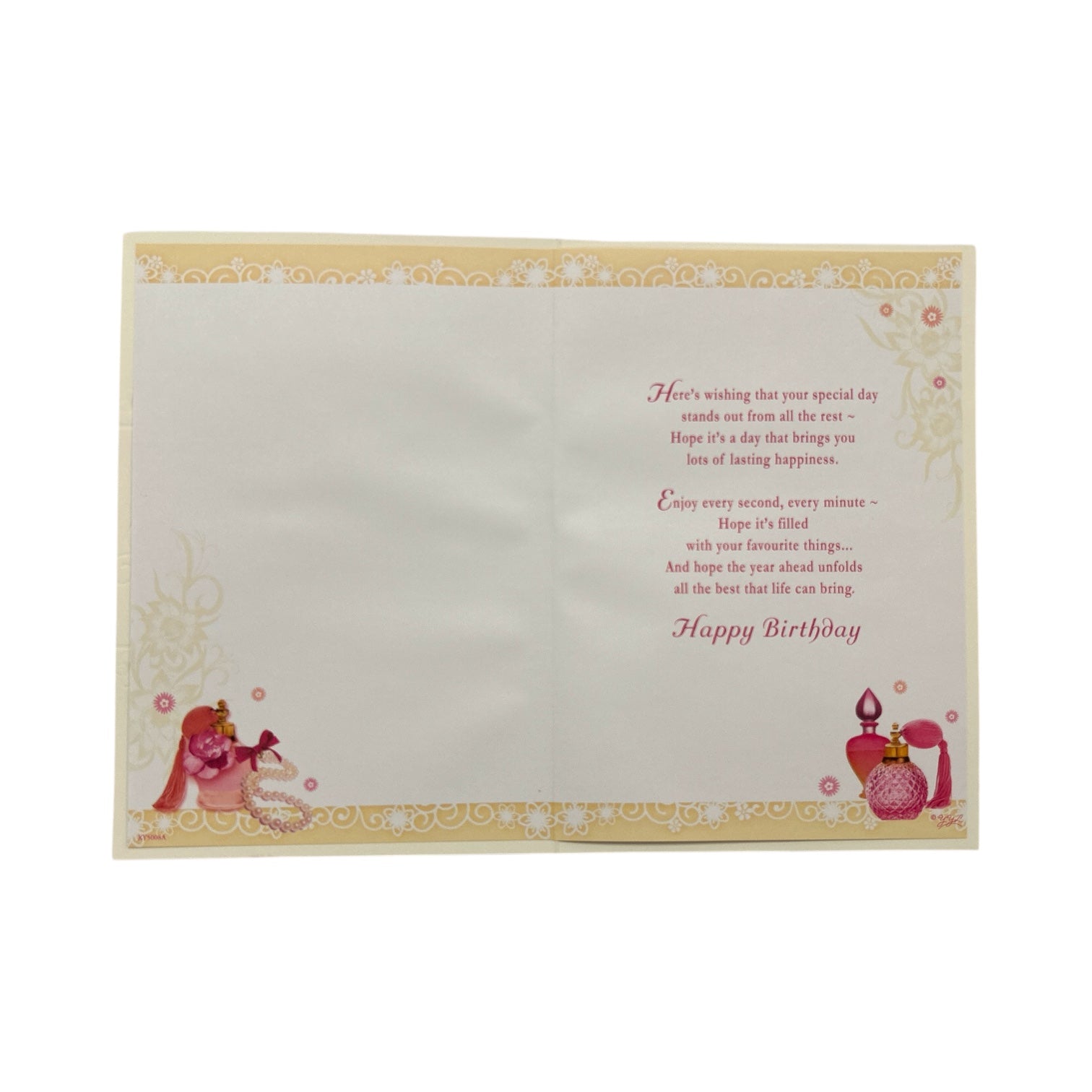 This elegant birthday card celebrates a special Grandma with a charming design of decorative perfume bottles and a heartfelt message. Pink and light pink perfume bottles are gracefully arranged on a decorative box, each adorned with stylized flowers and delicate ribbons, symbolizing beauty and elegance. The light cream/beige background features a subtle pattern of small flowers and lace-like details, creating a soft and sophisticated aesthetic. The words "For a Special Grandma" are written in an ornate and decorative font, emphasizing warmth and affection. Below, a heartfelt birthday message is placed at the bottom center of the card, expressing love, appreciation, and well wishes for Grandma’s special day. This beautifully designed card conveys love and admiration, making it a perfect keepsake for a cherished Grandma’s birthday celebration. Approx Size: 190 x 140mm.