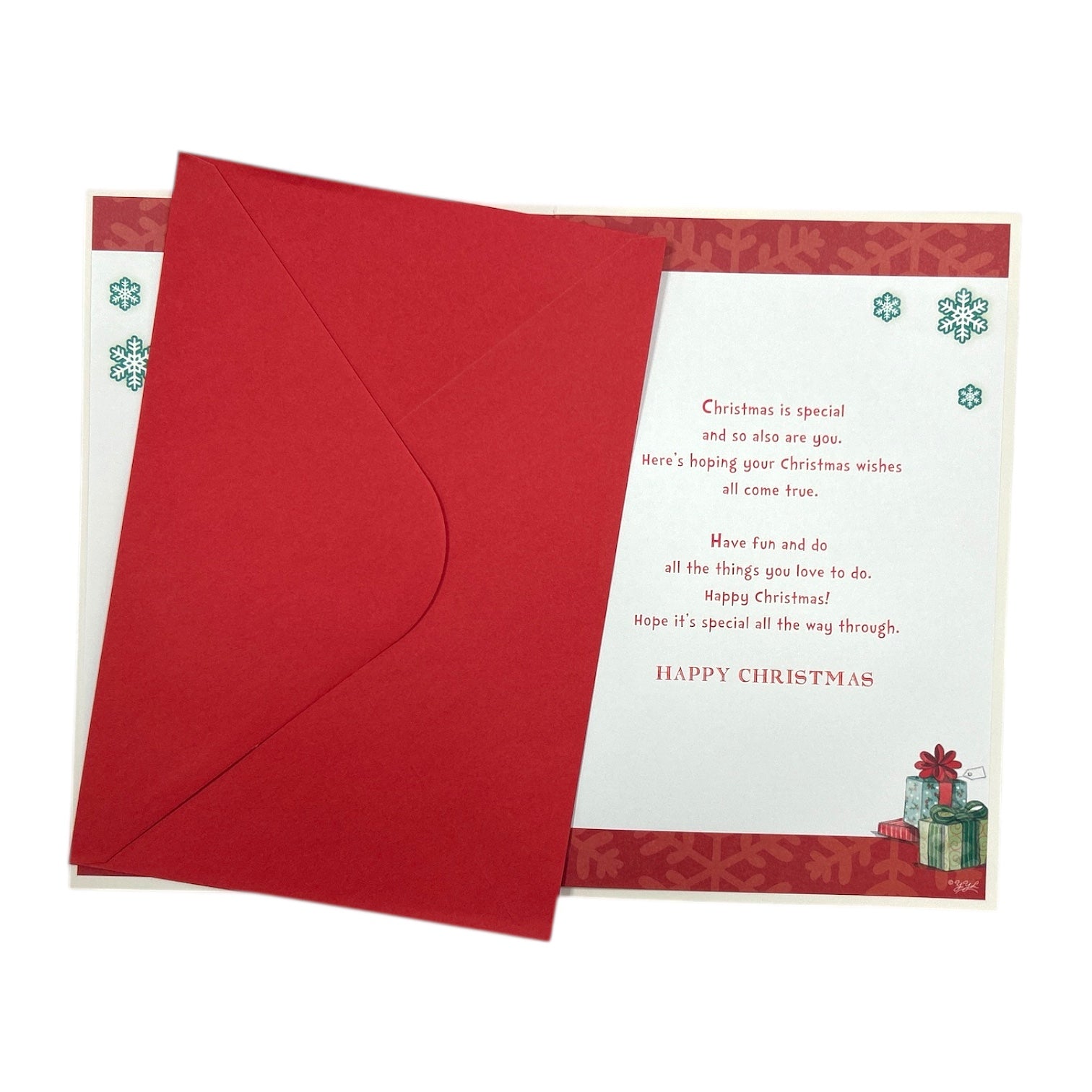 This playful Christmas card is a joyful way to celebrate a special Grandson during the festive season. The design features a cheerful young boy dressed in holiday attire—including a red sweater with a Christmas tree, Santa hat, earmuffs, and green scarf—posing for a selfie with wrapped presents at his feet. A green badge-style emblem adds a fun, modern twist, highlighting the theme “THE XMAS SELF-ie.” The background sparkles with colorful snowflakes and stars, enhancing the card’s vibrant energy. The message “Happy Christmas” and “For A Special Grandson” are prominently displayed, making this card ideal for catalog presentation or gifting. A lively keepsake that blends tradition with youthful charm. Approximate size: 225 x 155 mm.