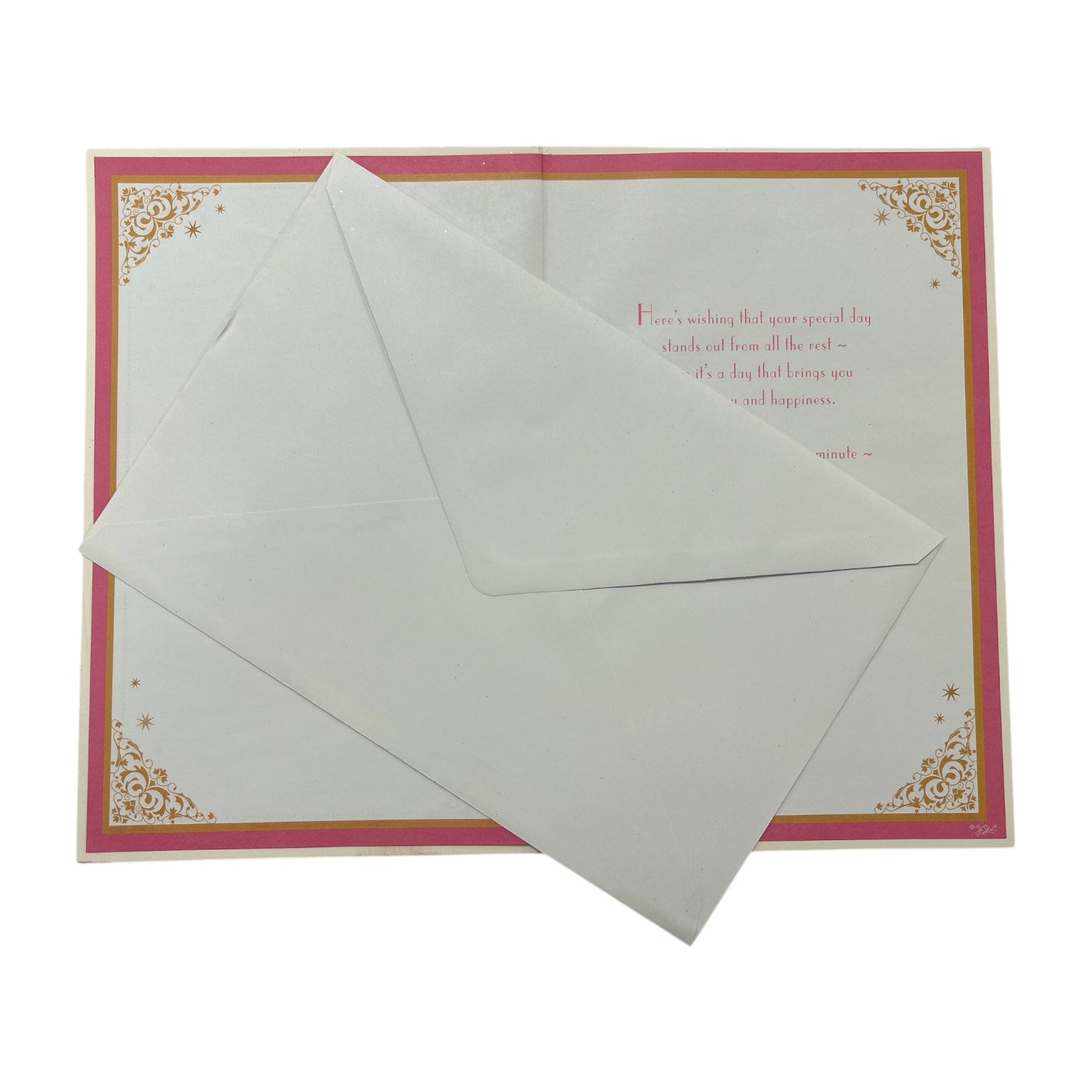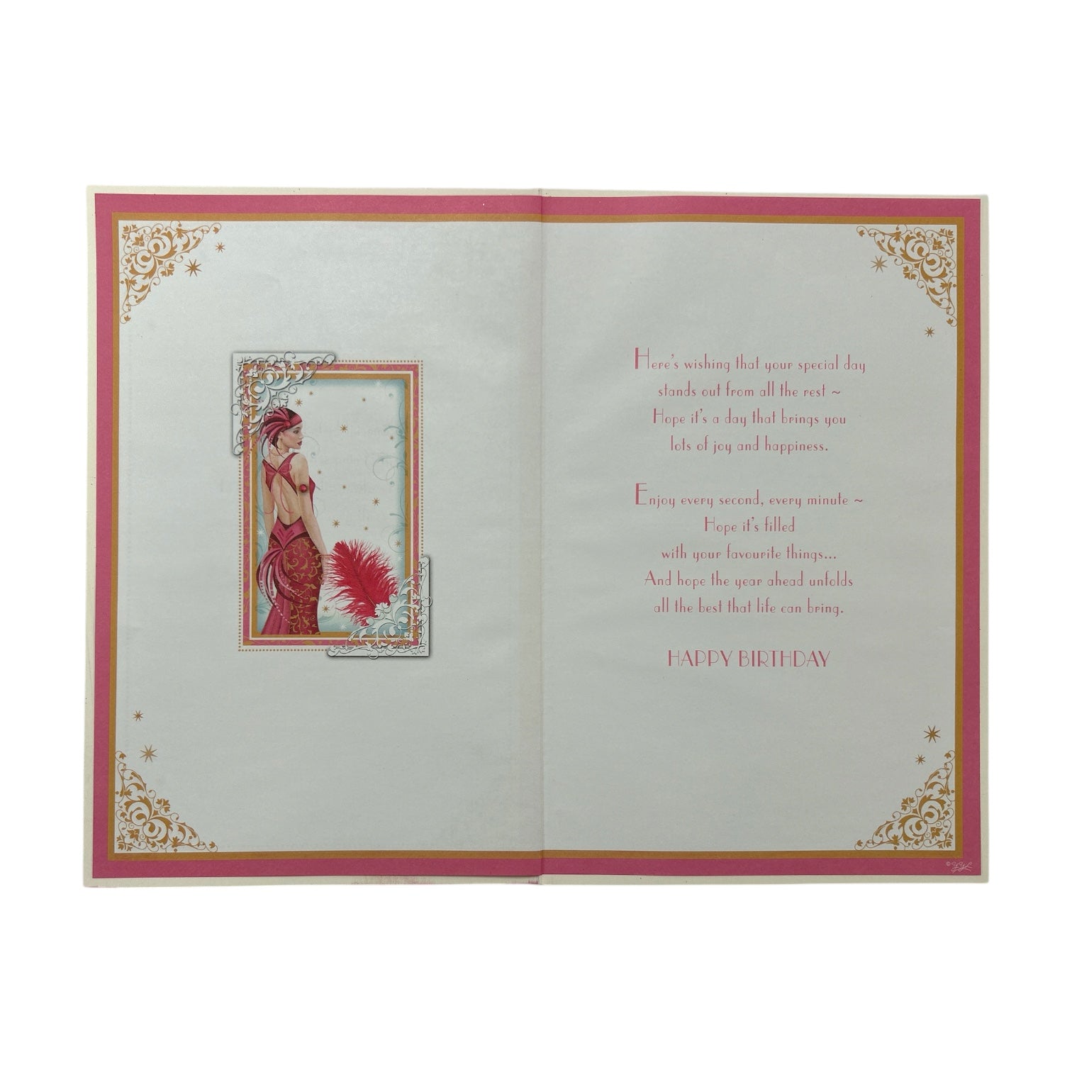 Make your Mam’s birthday extra special with this stunning and sophisticated card, designed to capture timeless elegance. The front showcases a graceful woman dressed in a glamorous flapper-era gown, embodying vintage charm and refinement. The intricate gold-colored patterns and ornate flourishes frame the design beautifully, adding a luxurious touch. A striking arrangement of red feather adds a touch of drama and vintage charm. The subtle glitter accents bring a dazzling sparkle, making this card a truly special keepsake. Inside, the same design continues, paired with heartfelt birthday wishes, making this card a perfect way to celebrate a remarkable milestone in a truly elegant and memorable way. The card comes with a coordinating envelope. Approximate size: 27.5 x 18.5 cm.