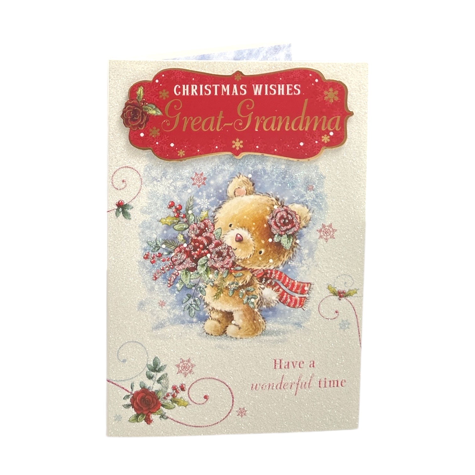 - Great Grandma Teddy and Festive Flowers Christmas Card
