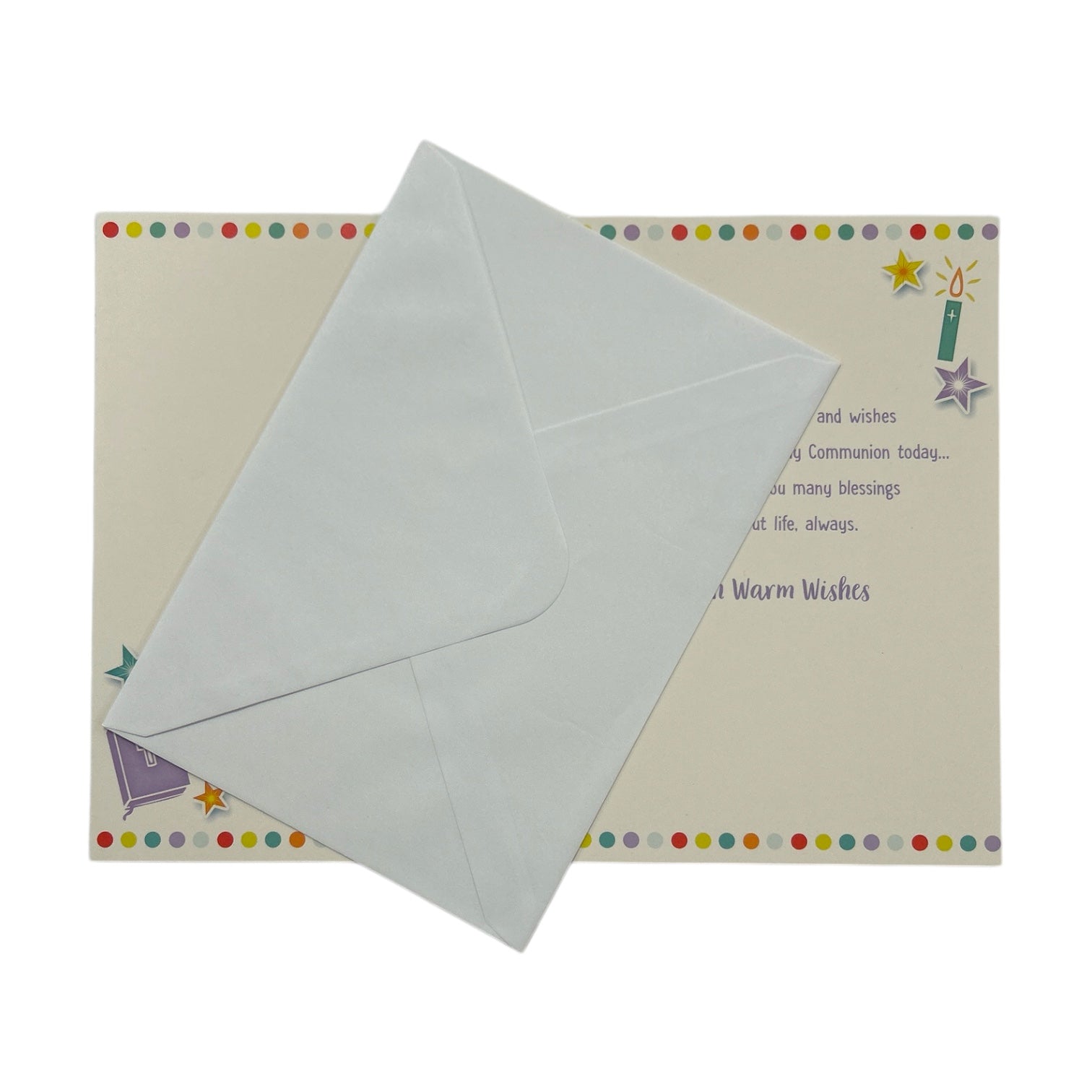 This joyful and faith-filled First Holy Communion card is designed to celebrate a special nephew on his sacred day. The card features a light beige background, with a soft light blue center that prominently displays the message "GOD BLESS YOU!" in vibrant, colorful lettering. Encircling the text are symbolic religious elements, including a golden chalice, a cross, a holy book, and a small church, representing faith, devotion, and divine blessings. A cheerful polka dot border in an array of bright colors surrounds the design, adding a festive and celebratory touch. The layout is thoughtfully arranged, making the message clear, meaningful, and visually engaging. Inside, a heartfelt blessing offers prayers and warm wishes for a future filled with faith, love, and the Lord’s guidance. The card comes with a coordinating envelope. Card size: Approx. 19.5 x 14 cm.