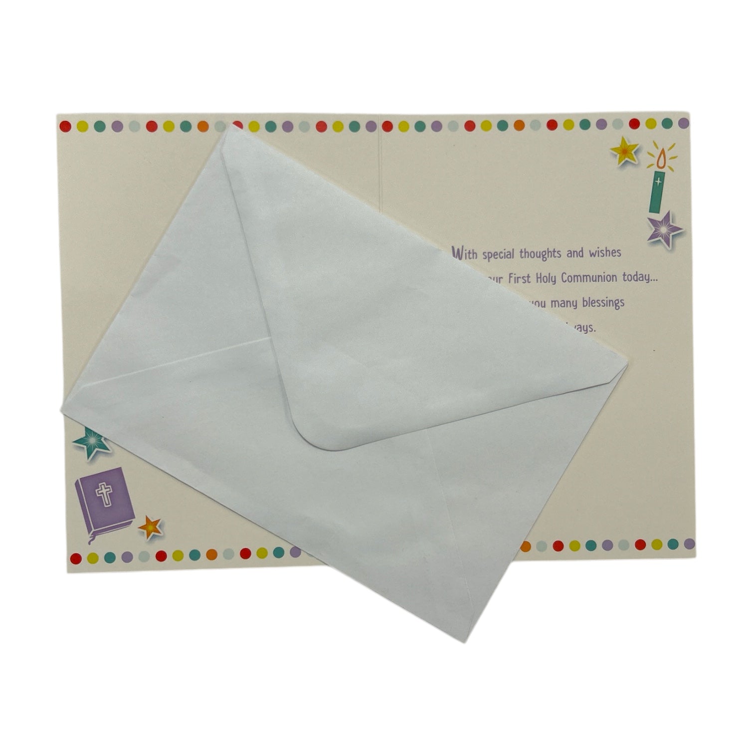 This beautifully designed First Holy Communion card celebrates a special son on his sacred milestone with a bright and meaningful design. The card features a light beige background, with a soft light blue center that prominently displays the heartfelt message "GOD BLESS YOU!" in vibrant, colorful lettering. Encircling the text are symbolic religious elements, including a golden chalice, a cross, a holy book, and a small church, representing faith, devotion, and divine blessings. A cheerful polka dot border in a mix of bright colors surrounds the design, adding a festive and celebratory touch. The overall layout is thoughtfully arranged, making the message clear, inspiring, and visually engaging. Inside, a heartfelt blessing completes the card, offering prayers and best wishes for a future filled with faith, love, and spiritual guidance. The card comes with a coordinating envelope. Card size: Approx. 19.5 x 14 cm.