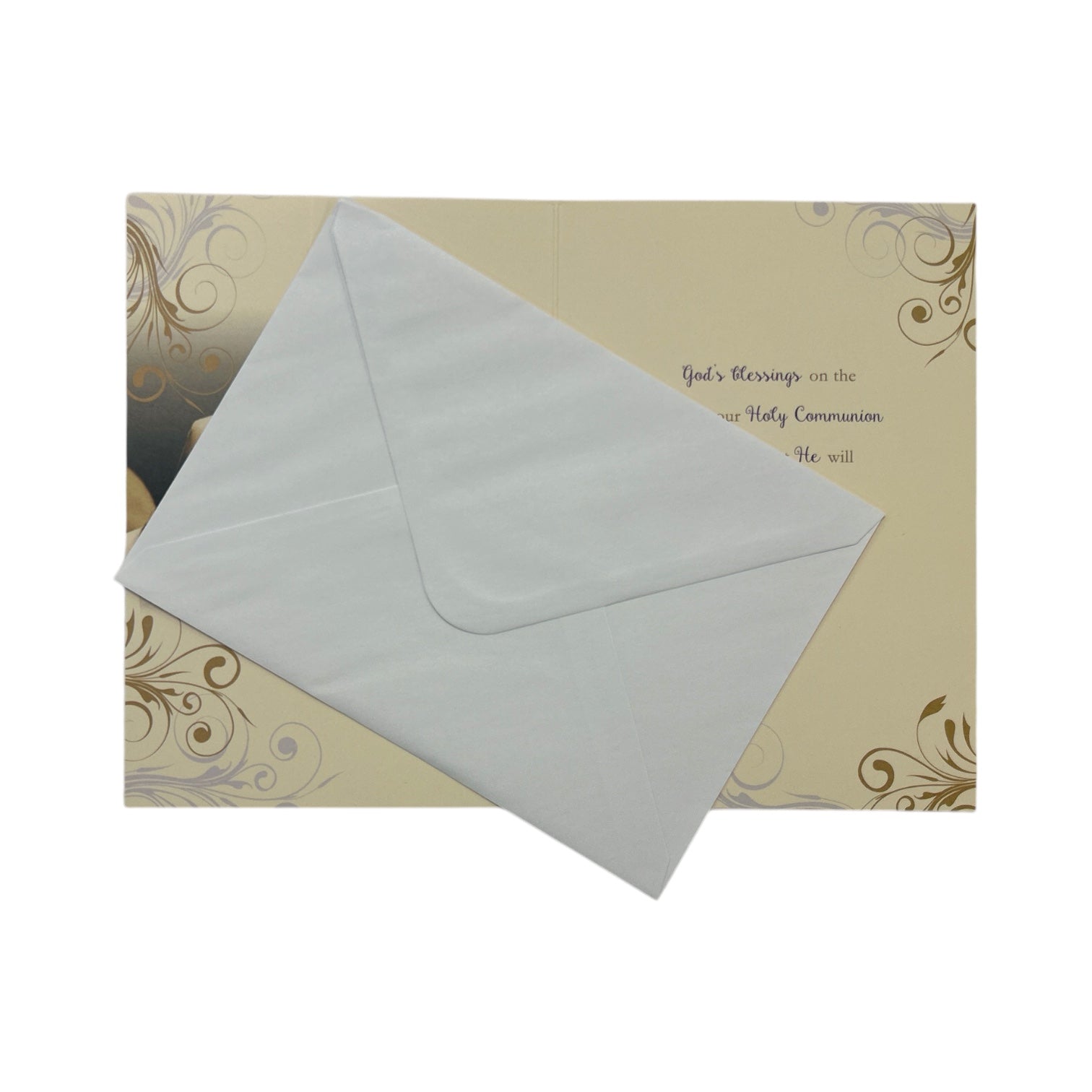 This elegant and meaningful First Holy Communion card for a beloved granddaughter captures the sacredness of the occasion. The design features a reverent depiction of a priest’s hands, gently holding a small plate and the Eucharist bread, symbolizing the act of administering Holy Communion. Set against a soft, light beige background, the card is adorned with delicate swirling floral patterns in a light gray hue, adding a touch of grace and serenity. At the top, the words "For You, Granddaughter, On Your First Holy Communion" are prominently displayed in a refined dark typeface, creating a heartfelt and spiritual emphasis. Inside, a loving message offers blessings, prayers, and warm wishes, celebrating this important step in her faith journey. The card comes with a coordinating envelope. Card size: Approx. 19.5 x 14 cm.