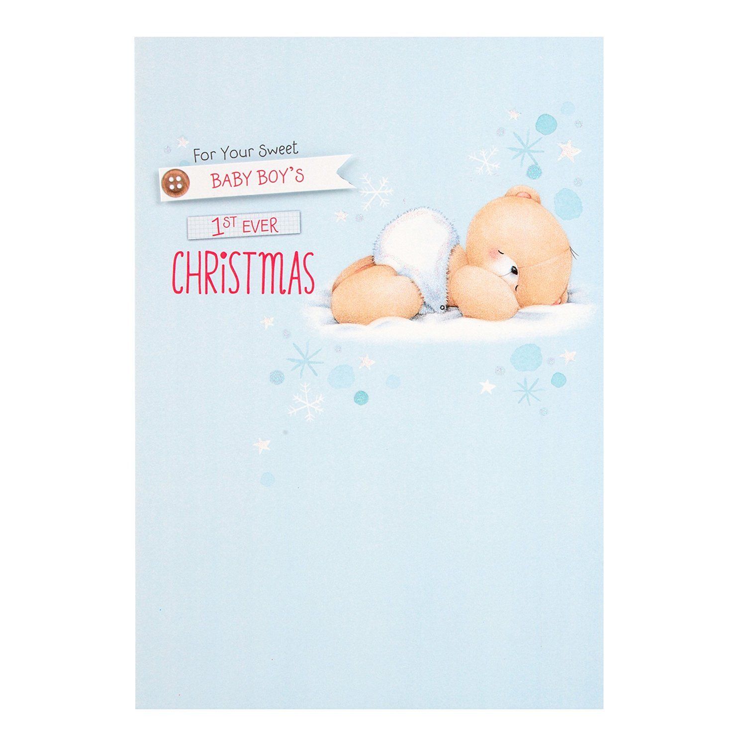 Send love on a baby boy's first Christmas with this adorable card from Hallmark. This quality medium-sized card, from our Forever Friends range, features a sweet illustration with a glittered finish. Includes: Envelope. Royal Mail Postage: Standard Letter Size.