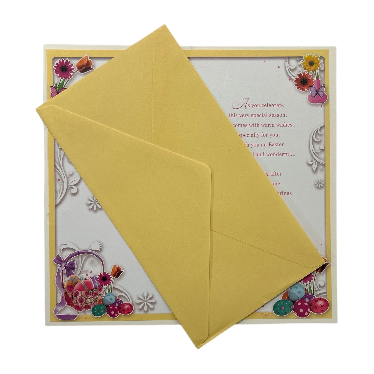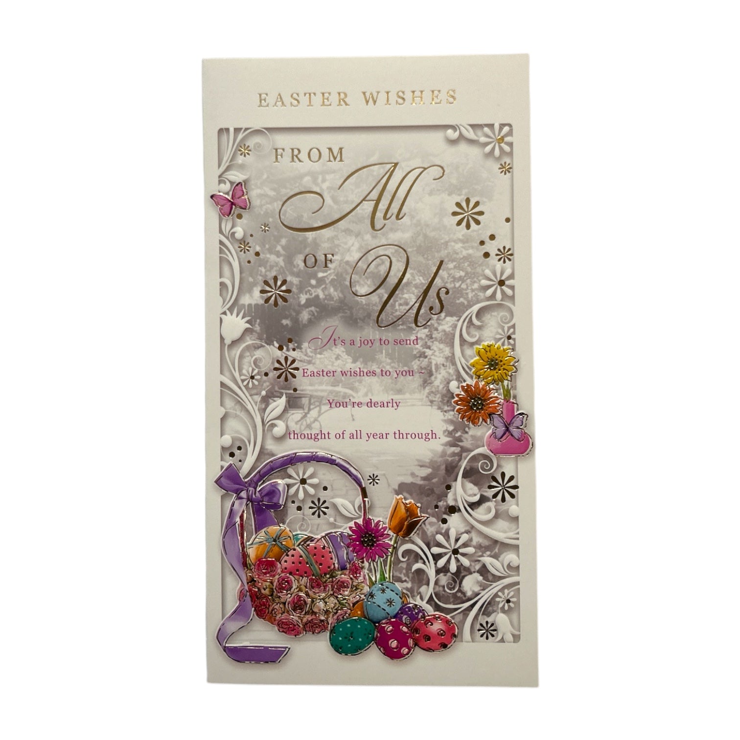 A lovely cards, perfect for sending kind, heartfelt messages to special friends or family members this Easter. featuring an illustrated design of Colourful, easter eggs decorated in vibrant patterns, embossed flowers add a whimsical touch to the festive design, with the words "From All of Us" on the front with sentimental verse and easter wishes message inside. The card comes with a coordinating envelope. Card size approx. : 23 x 12cm.