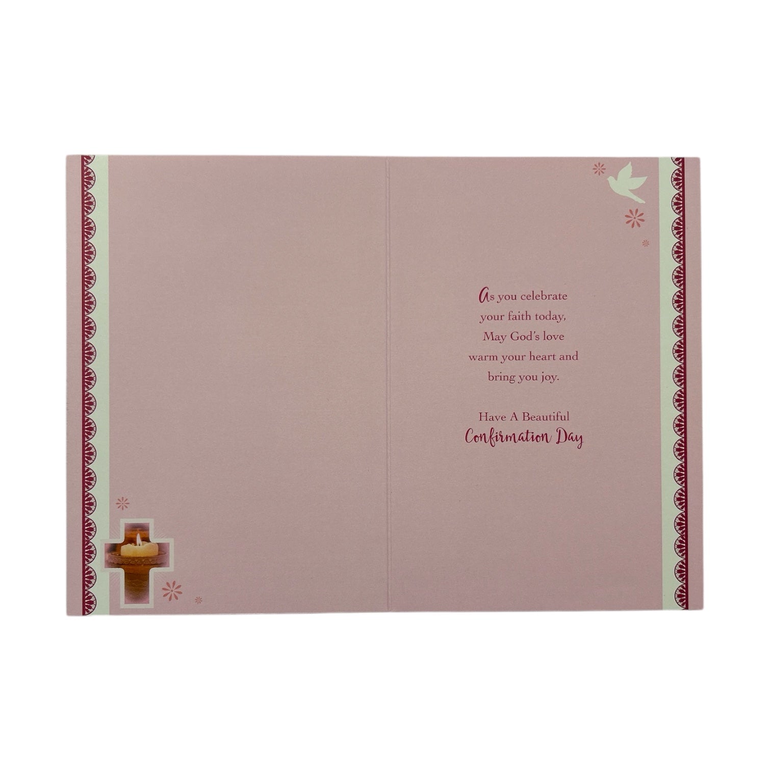 This elegant and heartfelt Confirmation card is designed especially for a beloved goddaughter on her special day of faith. A soft light-pink background, the card features a beautifully crafted cross and a glowing candle. The graceful and delicate design, enhanced with subtle floral and decorative accents, creates a sense of peace, warmth, and divine presence. The card's message conveys blessings and well wishes. Inside, a heartfelt message extends prayers and blessings, encouraging a continued journey in faith and spiritual growth. The card comes with a coordinating envelope. Card size: Approx. 19.5 x 14 cm.