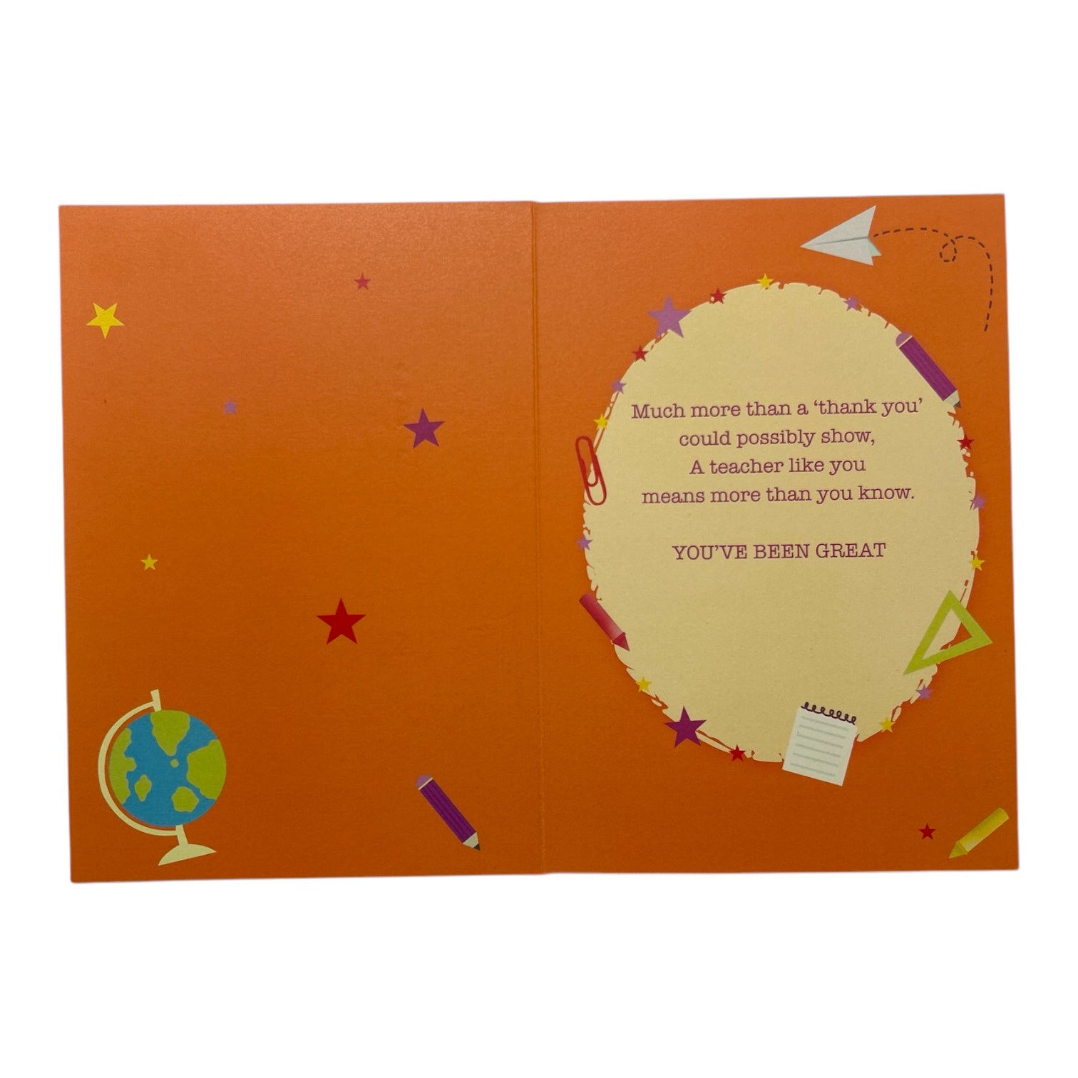 This good luck greeting card is designed to encourage and support someone starting at a new school. The front of the card has a blue background with a white circular center, decorated with educational symbols such as a globe, stationery, mathematical tools, and stars. This card is perfect for wishing someone success and confidence as they embark on a new school journey. Comes complete with a coordinating envelope. Card size: Approx. 19.5 x 14 cm.