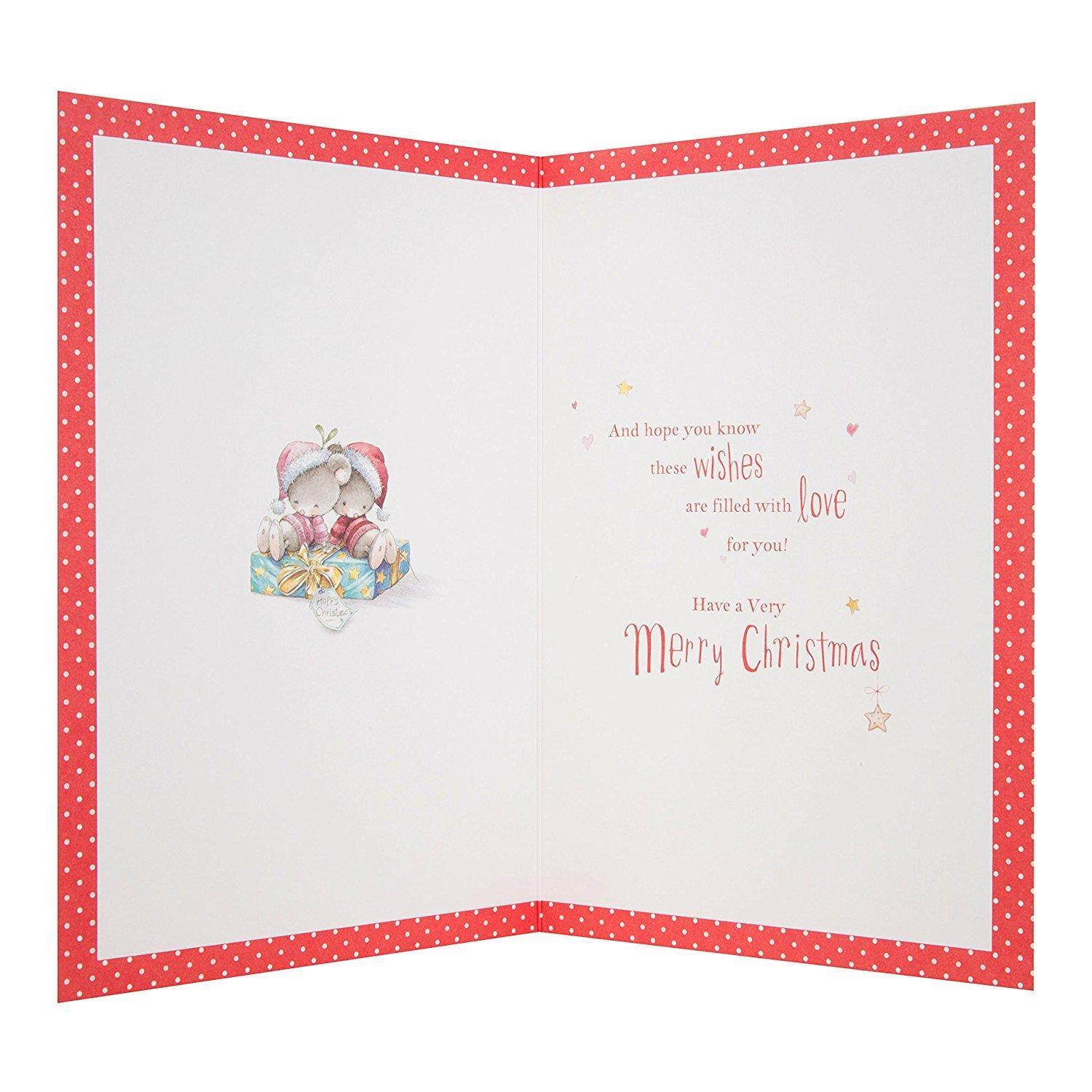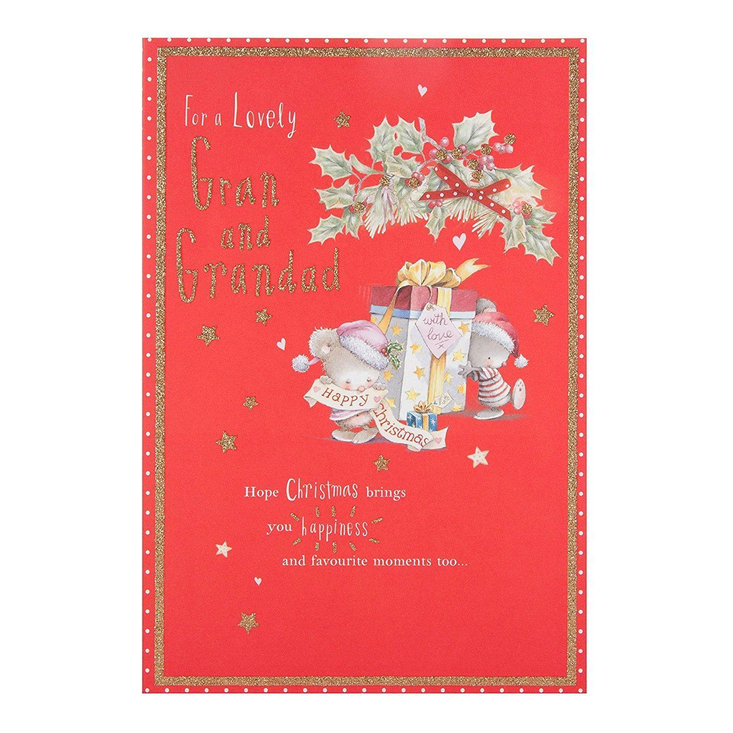 Send Christmas wishes to a special Gran and Grandad with this cute card from Hallmark. Finishes: Glitter. Includes: Red Envelope. Royal Mail Postage: Standard Letter Size. Size: 210 x 146 mm.