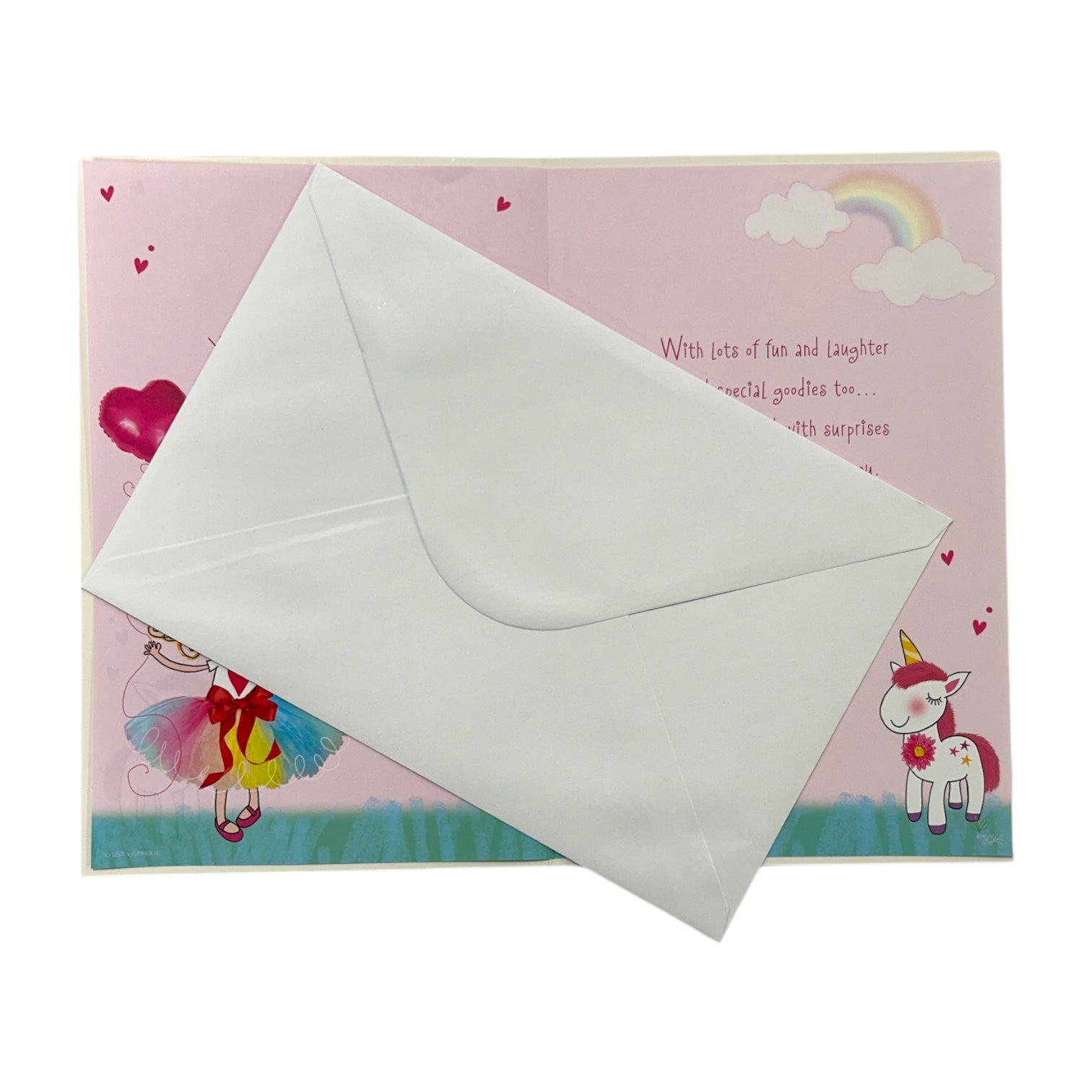 Celebrate your Granddaughter’s special milestone with this adorable and vibrant birthday card. The front of the card features a little girl in a multi-colored glitter dress, holding heart-shaped and star foil balloons, as well as two yellow and green balloons, capturing her joy and excitement. A fluffy unicorn stands beside her, adding a touch of magic to the scene. The card’s soft pastel-colored background is filled with glittery clouds and a rainbow, creating an atmosphere of wonder and joy. The text "You're 1 Granddaughter" and "Birthday" is displayed in multicolored, playful font, highlighting the festive mood. Additionally, a large, round badge with the message "1 Today" adds a fun touch, making this card extra special for your Granddaughter. Inside, you'll find warm birthday wishes that are sure to bring a smile to his face. The card comes with a coordinating envelope. Approximate size: 27.5 x 18.5.