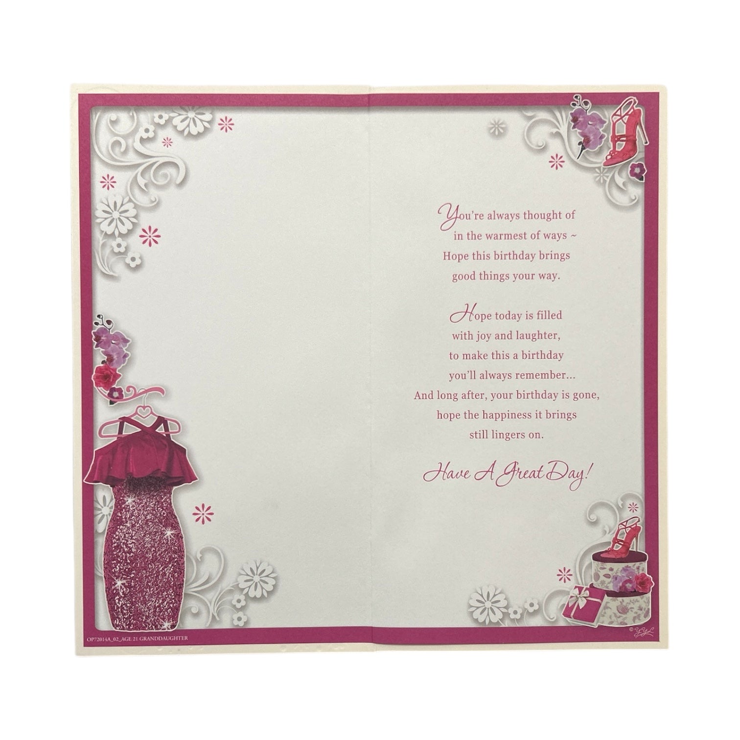 Celebrate your granddaughter's milestone with this Card designed especially for her! The card features an elegant embossed design of a pretty pink dress complemented by adorable pink shoes, making it a charming choice for her special day. The foil details add a touch of sparkle, ensuring the card stands out beautifully. The front of the card is adorned with a lovely verse, capturing the joy of turning 21. Inside, the card continues the same delightful design and includes beautiful wishes, expressing your love and excitement for her new chapter in life. This card comes complete with a coordinating envelope. Approximate Size: 9" x 4.75" (23cm x 12cm).