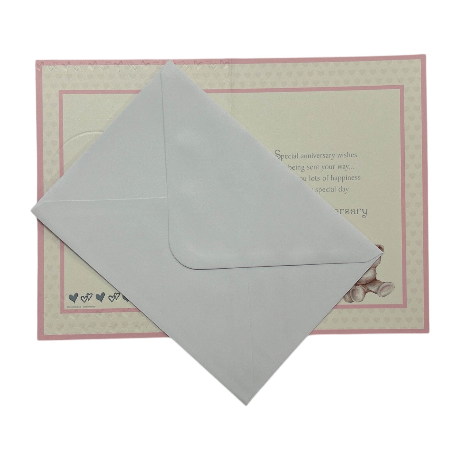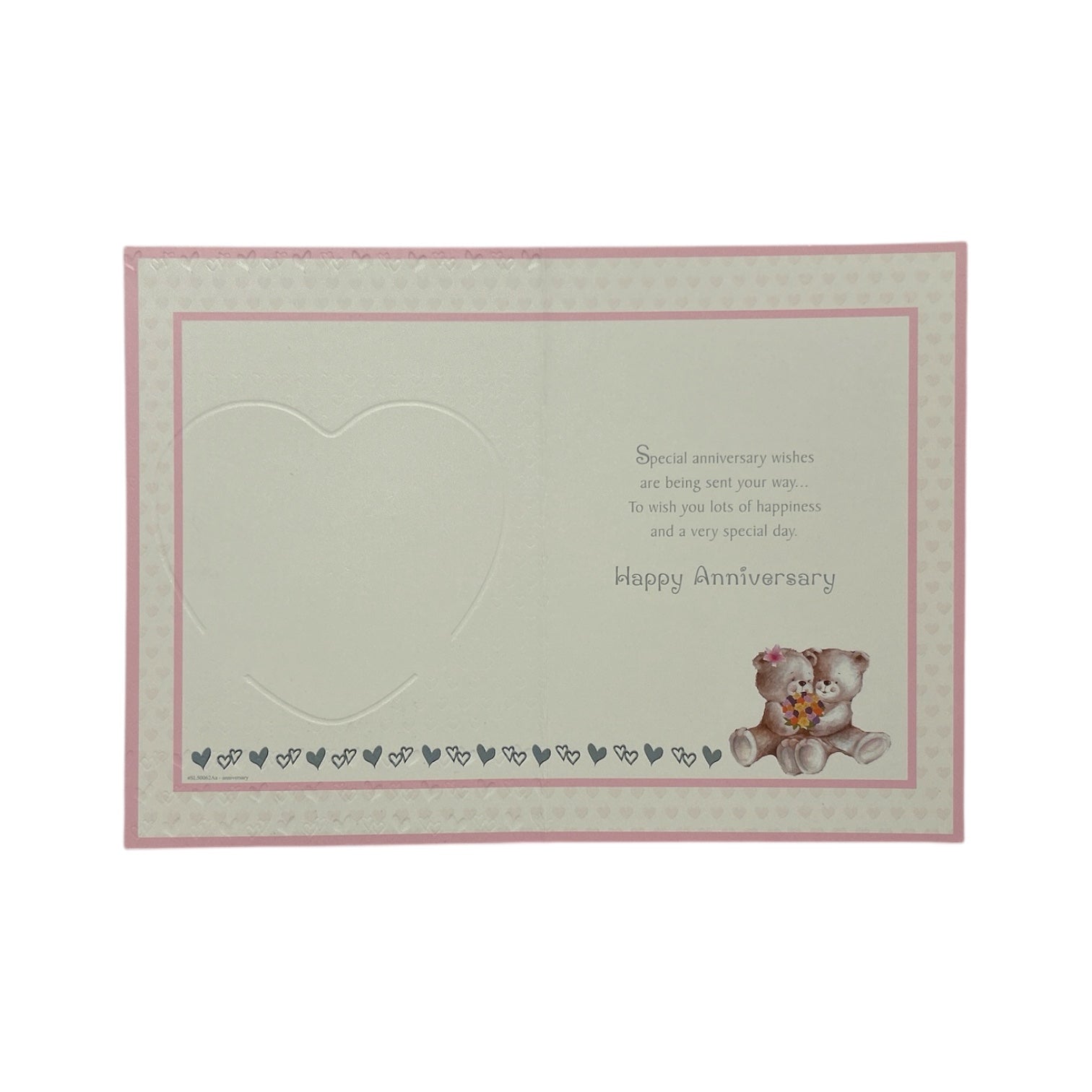 This charming pink anniversary card is designed to celebrate the love and joy of a Grandma & Grandad's special day. At the center, two adorable teddy bears sit side by side within a heart-shaped design, facing forward with warmth and affection. Between them, they hold a beautiful bouquet of flowers, symbolizing love and happiness. The heart is elegantly outlined in a lighter shade of pink, creating a soft, layered effect. The background is a delicate light beige, adorned with a repeating pattern of small silver hearts, adding a touch of romance. Above the heart, the words "ANNIVERSARY WISHES" are inscribed in a graceful font, while "Grandma & Grandad" is elegantly placed below in a dark-colored font for contrast and prominence. Inside, heartfelt anniversary wishes complete this beautiful and sentimental greeting. The card comes with a coordinating envelope. Card size: Approx. 19.5 x 14 cm.