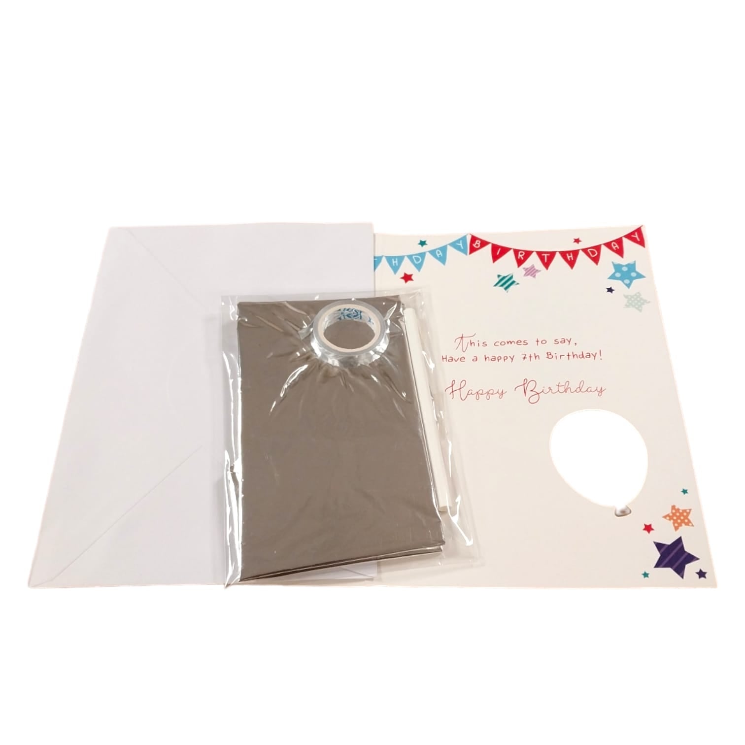 A contemporary foil finished greeting card by Balloon Boutique. Air fill only (not suitable for helium). Includes 2 Foil Balloons, straw for inflating balloons. 2m Ribbon for handing balloons. Unsuitable for helium. Size of card 190x130mm. Message inside: This comes to say, Have a happy 7th Birthday! Happy Birthday.