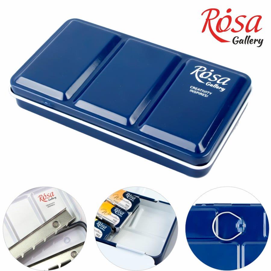 Rosa Gallery Watercolour Cases are metal boxes with two palettes of different configurations. They have a special insert for the pans and a convenient finger holder on the bottom of the case, which makes it easy to hold the paint in a hand while working. Box Sets can be carried in a bag or sketchbox easel. Now it will be convenient for you to work with ROSA Gallery watercolours both in the studio and in the open air. Reliability - pans are firmly fixed in the middle of the case; they do not fall out even during overturning. Versatility - pans and semi-pans of different manufacturers fit it. Convenience - it has a finger holder, which makes it easy to hold the case in your hand. Stylish design. Key properties: Three lids of the palette, Pans and semi-pans, Strong clips hold pans in two rows, Finger holder for safe stay in the hand.