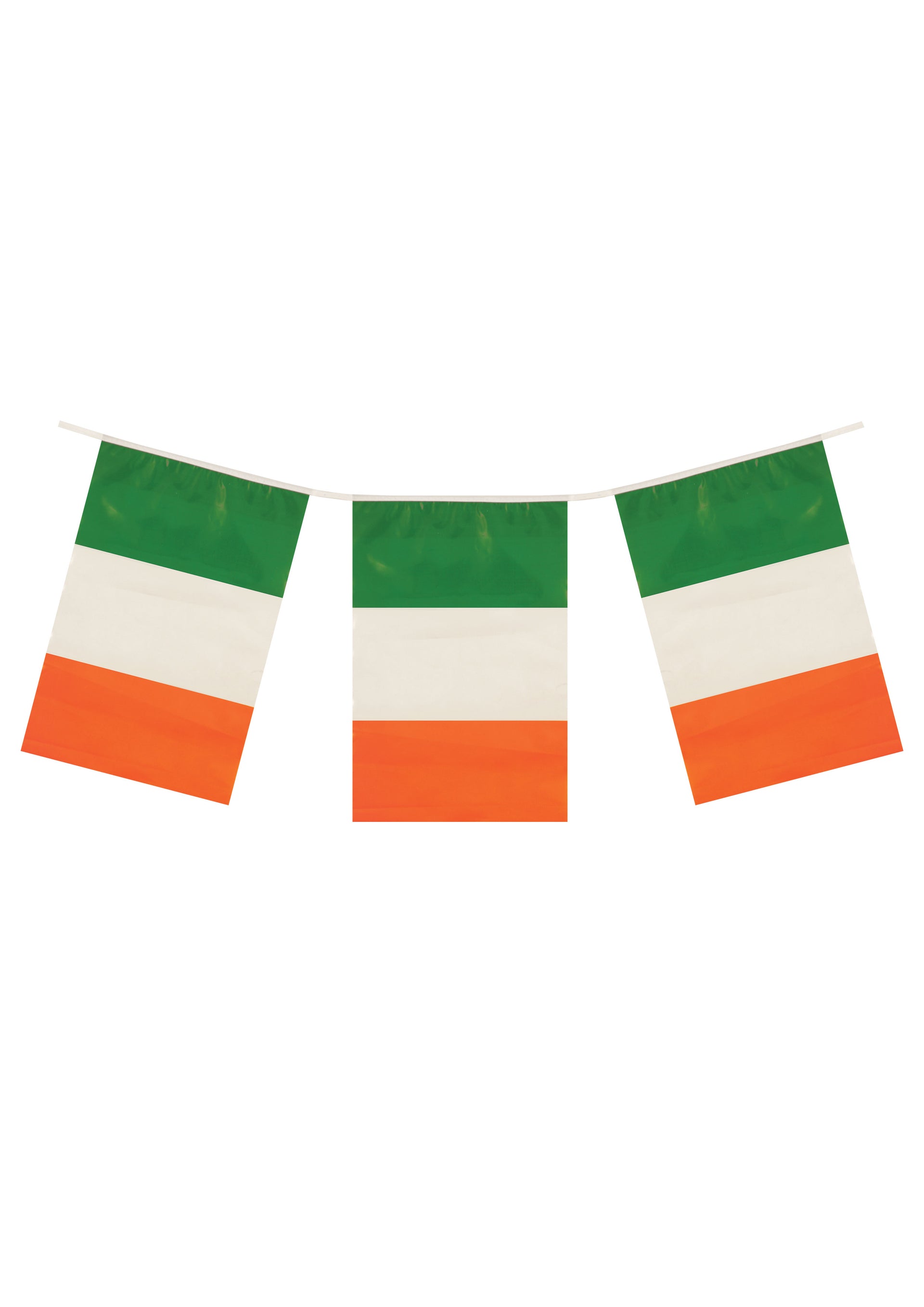 Ireland Flag Bunting 10m (20 Flags). This string of flag bunting shows the Irish Tricolour flag. The bunting is 10m long with 20 flags. Individual flags measure approx. 16cm x 24cm. Material: PVC.