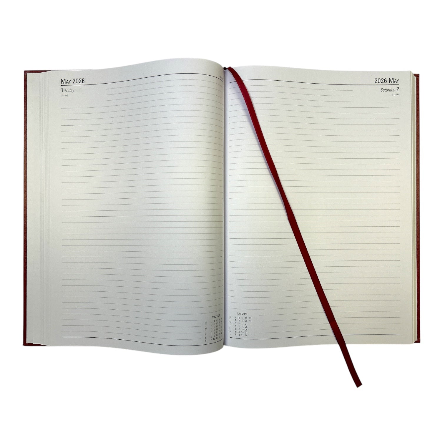 2026 A4 Day Per Page Burgundy Desk Diary by Janrax. This day per page diary is ideal for meetings, appointments, deadlines and other plans, with a reference calendar on each page for help planning ahead. The diary also includes current and forward year planners, and a ribbon page marker for quick and easy reference.