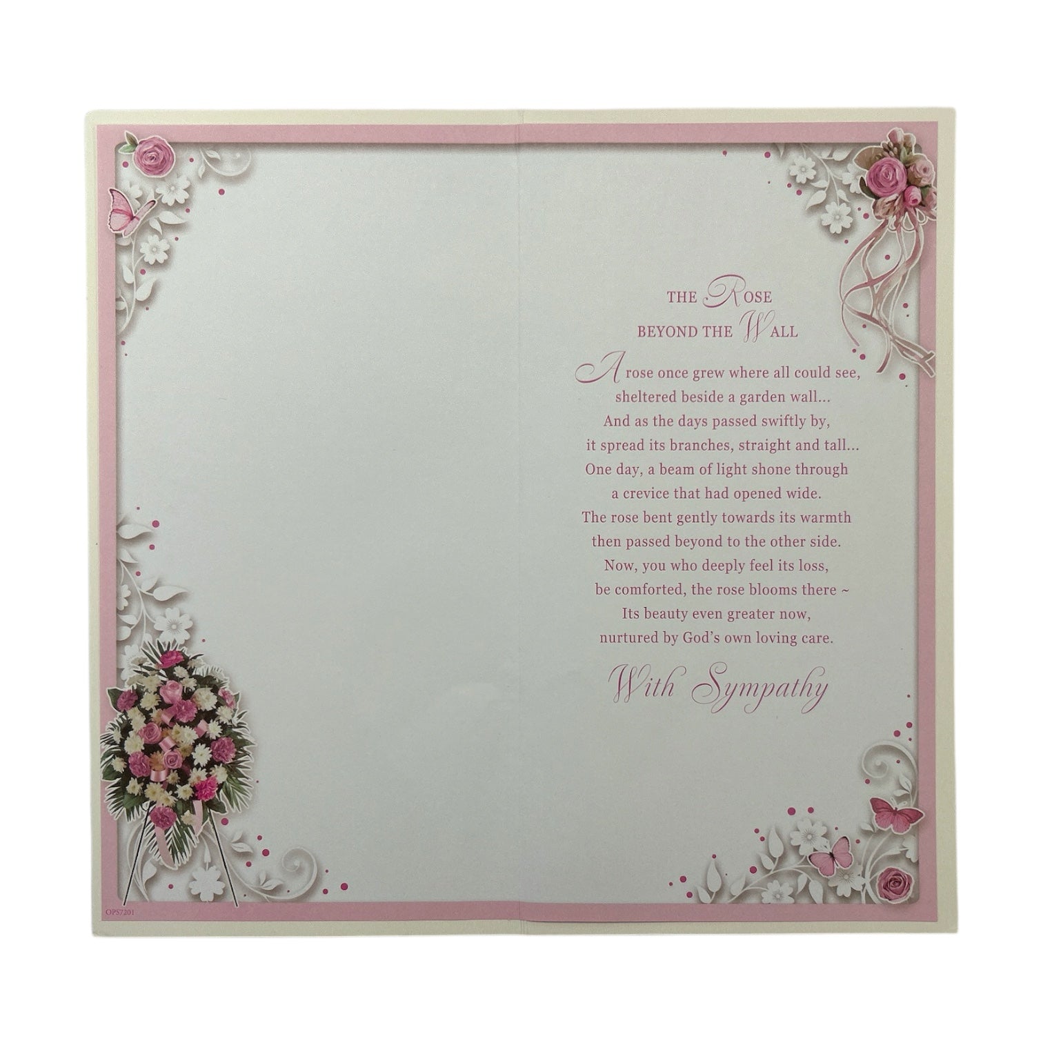 This heartfelt sympathy card offers comfort and support to those mourning the loss of a mother. Featuring a delicate floral design with soft pink roses and graceful butterflies, the card’s composition embodies remembrance, love, and gentle solace. The embossed pink rose bouquets add a touch of elegance and warmth, accompanying the words "With Deepest Sympathy On The Loss Of Your Mum." Inside, a similarly decorated paper insert presents the touching verse "The Rose Beyond The Wall," offering a message of hope and remembrance. With a soft color palette and intricate floral motifs, this thoughtfully designed card serves as a meaningful keepsake, extending condolences and heartfelt support during a difficult time. Card size: 12.5 cm x 23.5 cm.