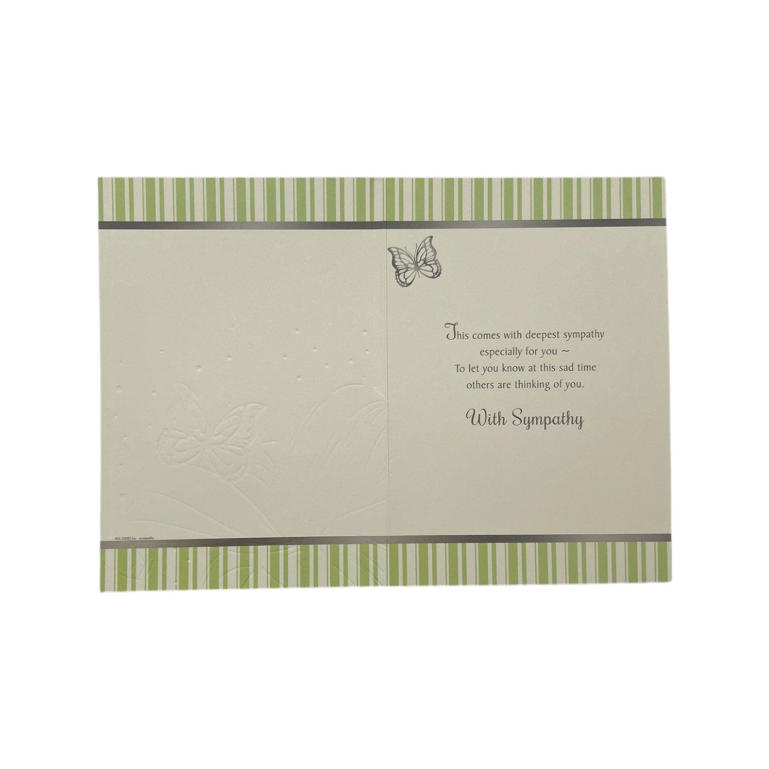 This elegant sympathy card offers a heartfelt expression of condolences on the loss of a beloved wife. The design features a delicate, embossed image of a white lily and butterfly, symbolizing purity, love, and remembrance. The light beige background provides a soft, comforting tone, adorned with small, decorative, embossed snowflake-like designs, adding a gentle touch of elegance. The words "With Deepest Sympathy," "On The Loss Of Your," and "Wife" are thoughtfully presented in a dark, refined font, creating a striking yet respectful contrast against the light background. Inside, a heartfelt condolence message offers words of comfort and support, making this card a thoughtful way to express sympathy during a difficult time. The card comes with a coordinating envelope. Card size: Approx. 19.5 x 14 cm.