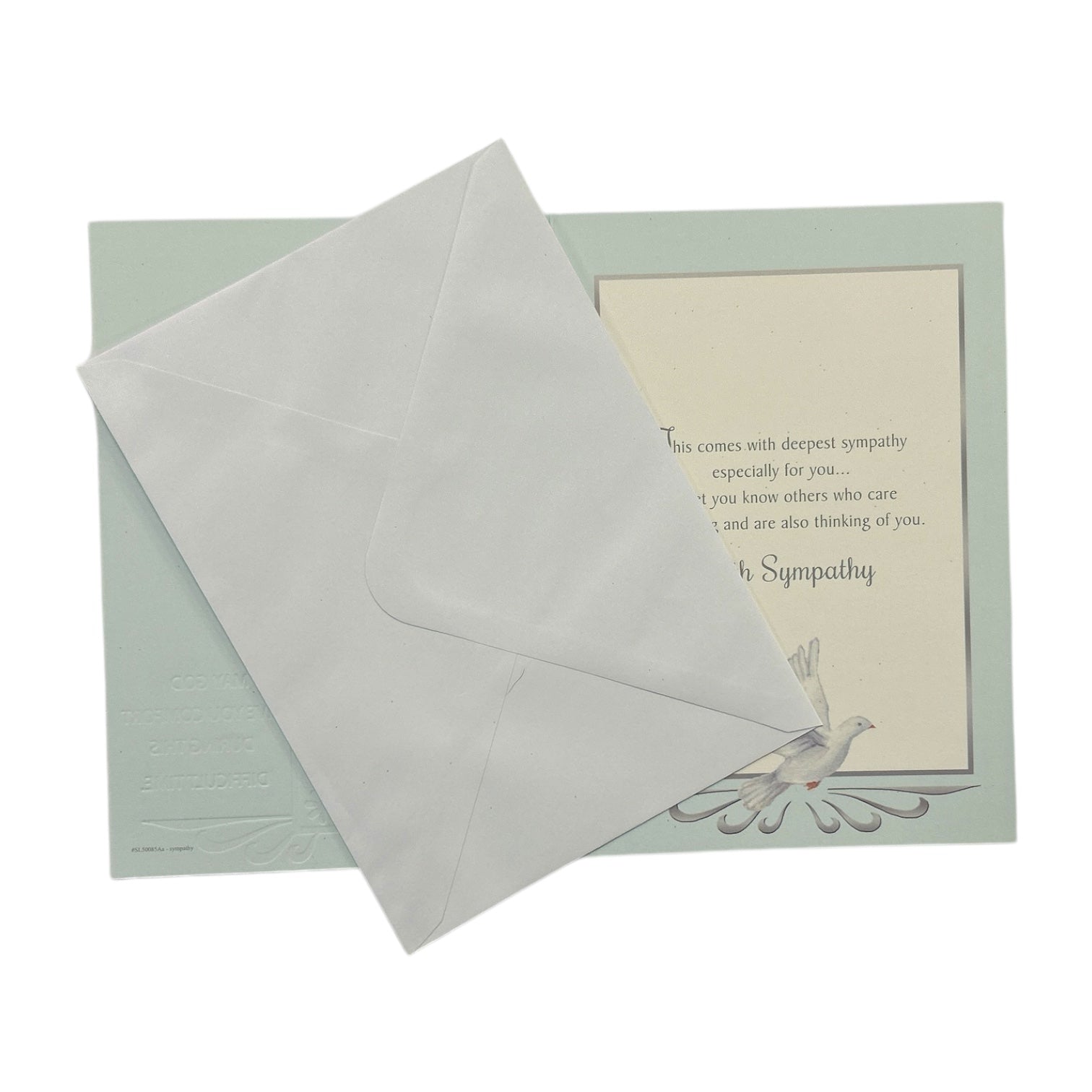This graceful light-blue sympathy card offers heartfelt condolences for the loss of a beloved mother. At the center, a light purple/lavender cross stands as a symbol of faith and remembrance, adorned with a delicate cream/off-white lily, representing purity and devotion. To the left of the cross, a white dove is depicted in flight, conveying peace and spiritual comfort. At the top of the card, the words "With Deepest Sympathy on the Loss of Your Mum" are elegantly written in a silver foil font, providing a gentle and soothing touch. Below the cross, a message of solace, "May God give you comfort during this difficult time," is inscribed in a silver font, offering strength and support. This thoughtfully designed card serves as a meaningful way to express sympathy and bring comfort during a time of loss. The card comes with a coordinating envelope. Card size: Approx. 19.5 x 14 cm.