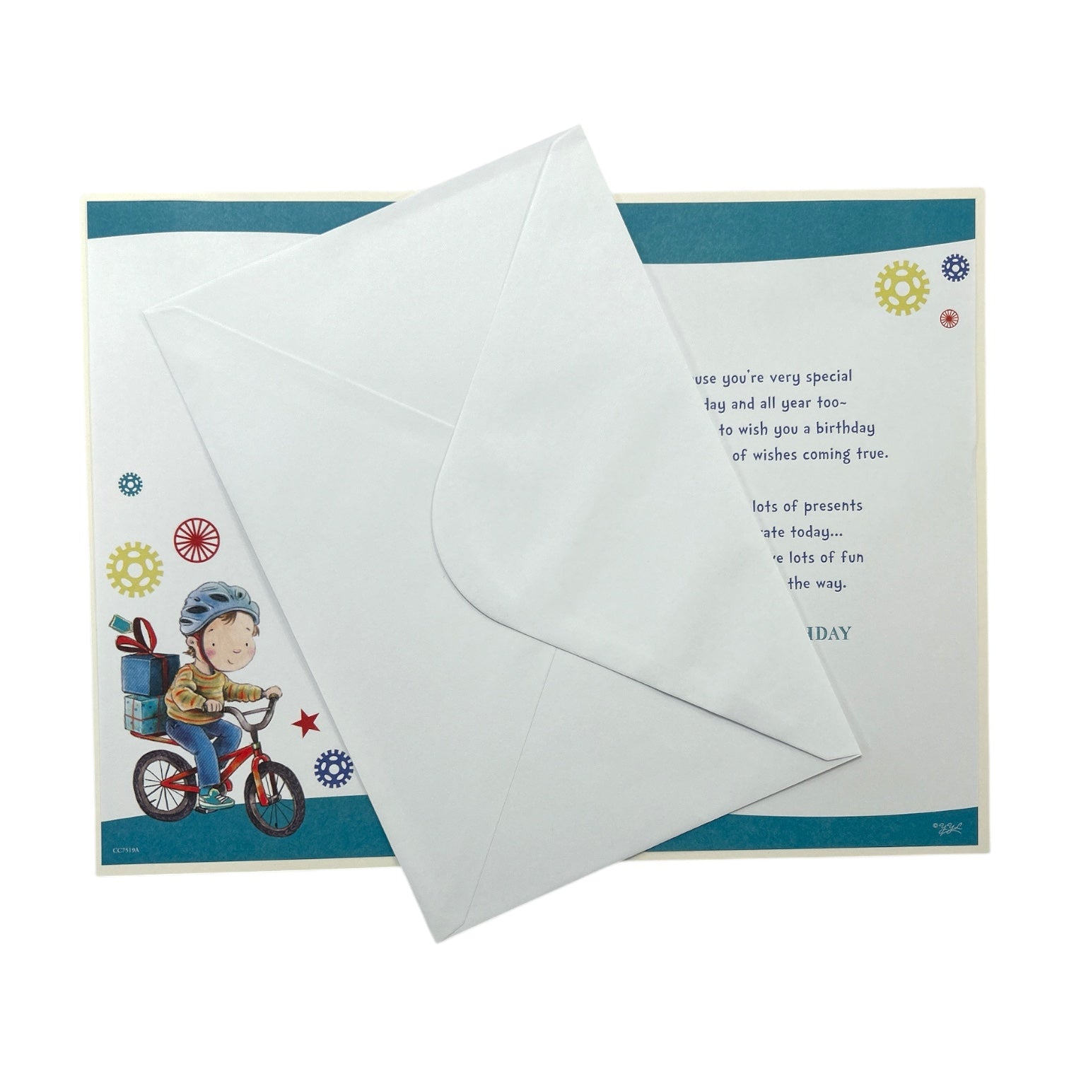 'For A Special Nephew You Are 4 Today Have A Wheely Great Birthday' Birthday Card With Badge. A bright card, perfect for sending birthday wishes to your lovely Nephew to brighten his special day. Featuring a wonderful design of cute boy ride a bicycle, with embossed foil details. The card comes with a coordinating envelope. Card Measures Approx. 22cm x 15cm and the Badge measures Approx. 6cm in Diameter and has a Plastic Clip For Fastening.