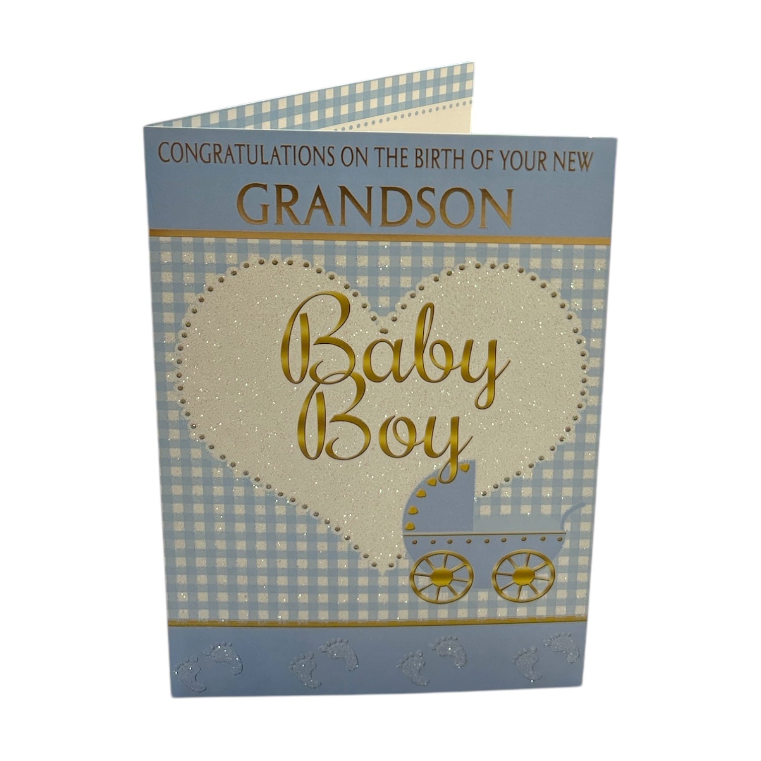 This charming blue greeting card is a beautiful way to celebrate the birth of a precious baby boy. The design features a decorative heart shape at the center, elegantly displaying the words "Baby Boy" in gold lettering, adding a touch of warmth and sophistication. The background is adorned with a blue and white gingham pattern, creating a classic and visually appealing aesthetic. Below the heart, a small blue baby pram is delicately placed in the lower-middle section, reinforcing the sweet baby theme. The blue and white color scheme is consistently carried throughout the design, ensuring a soft and cohesive look. At the bottom, the heartfelt message, "Congratulations on the birth of your new Grandson," is elegantly printed in gold lettering against a light blue background, making the sentiment clear and celebratory. Inside, warm congratulations wishes complete this beautifully designed keepsake, making it a perfect way to welcome the new arrival. The card comes with a coordinating envelope. Card size: Approx. 19.5 x 14 cm.