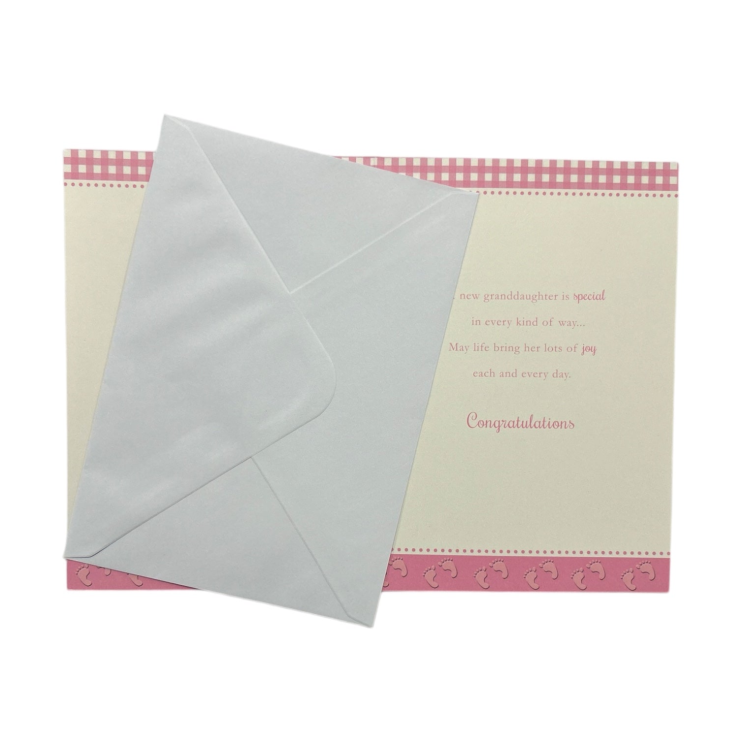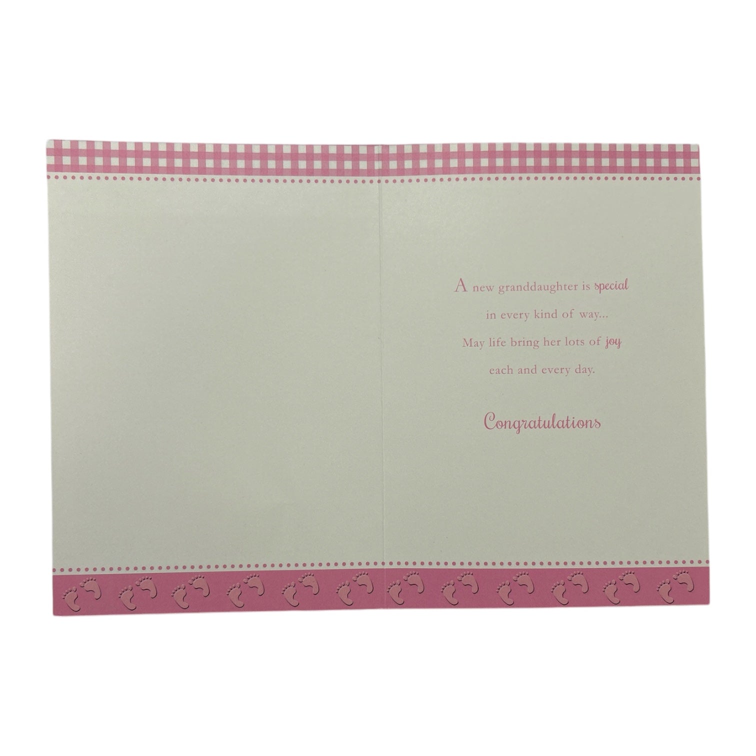 This charming pink greeting card is a beautiful way to celebrate the birth of a precious baby girl. The design features a decorative heart shape at the center, elegantly displaying the words "Baby Girl" in gold lettering, adding a touch of warmth and sophistication. The background is adorned with a pink and white gingham pattern, creating a classic and visually appealing aesthetic. Below the heart, a small pink baby pram is delicately placed in the lower-middle section, reinforcing the sweet baby theme. The pink and white color scheme is consistently carried throughout the design, ensuring a soft and cohesive look. At the bottom, the heartfelt message, "Congratulations on the birth of your new Granddaughter," is elegantly printed in gold lettering against a light pink background, making the sentiment clear and celebratory. Inside, warm congratulations wishes complete this beautifully designed keepsake, making it a perfect way to welcome the new arrival. The card comes with a coordinating envelope. Card size: Approx. 19.5 x 14 cm.