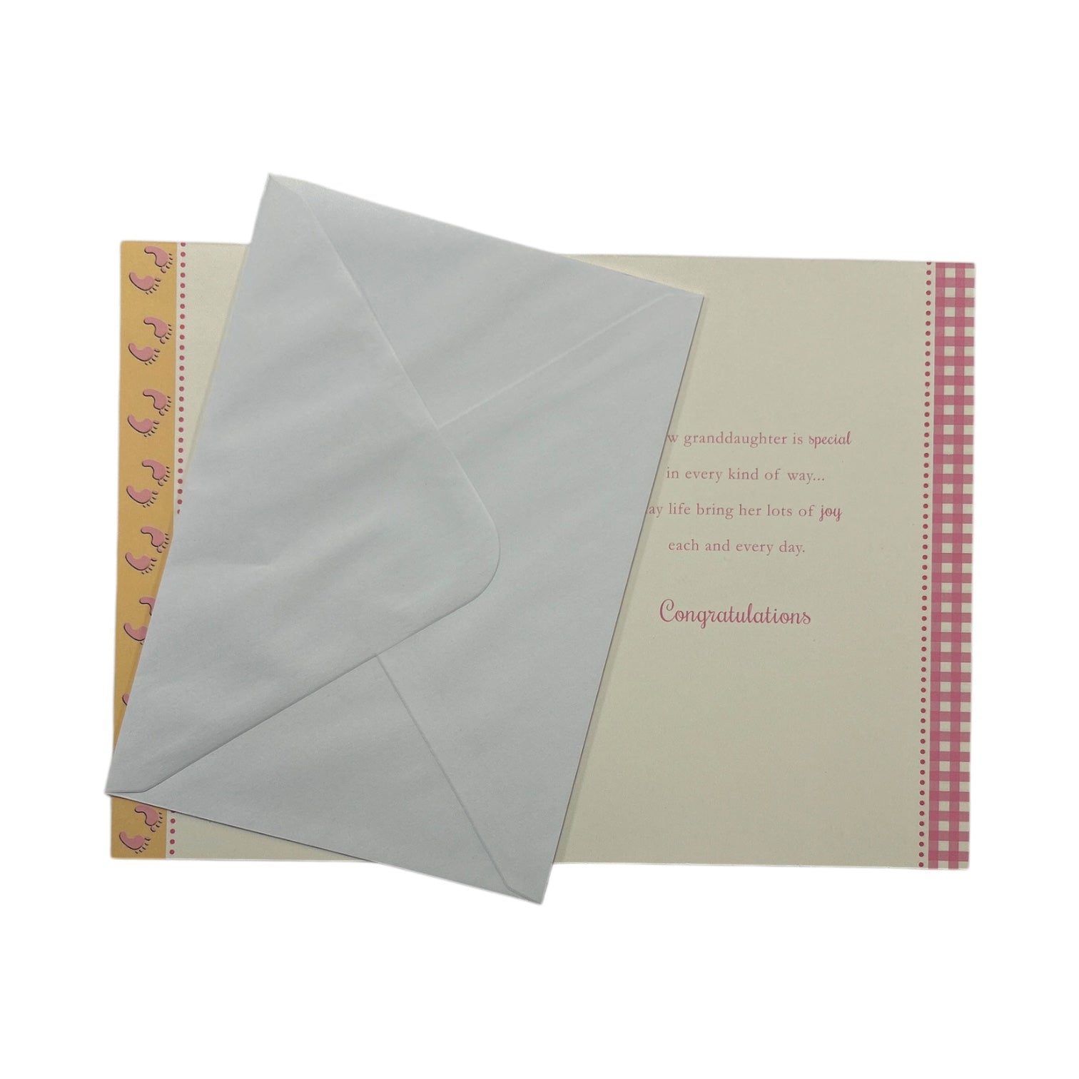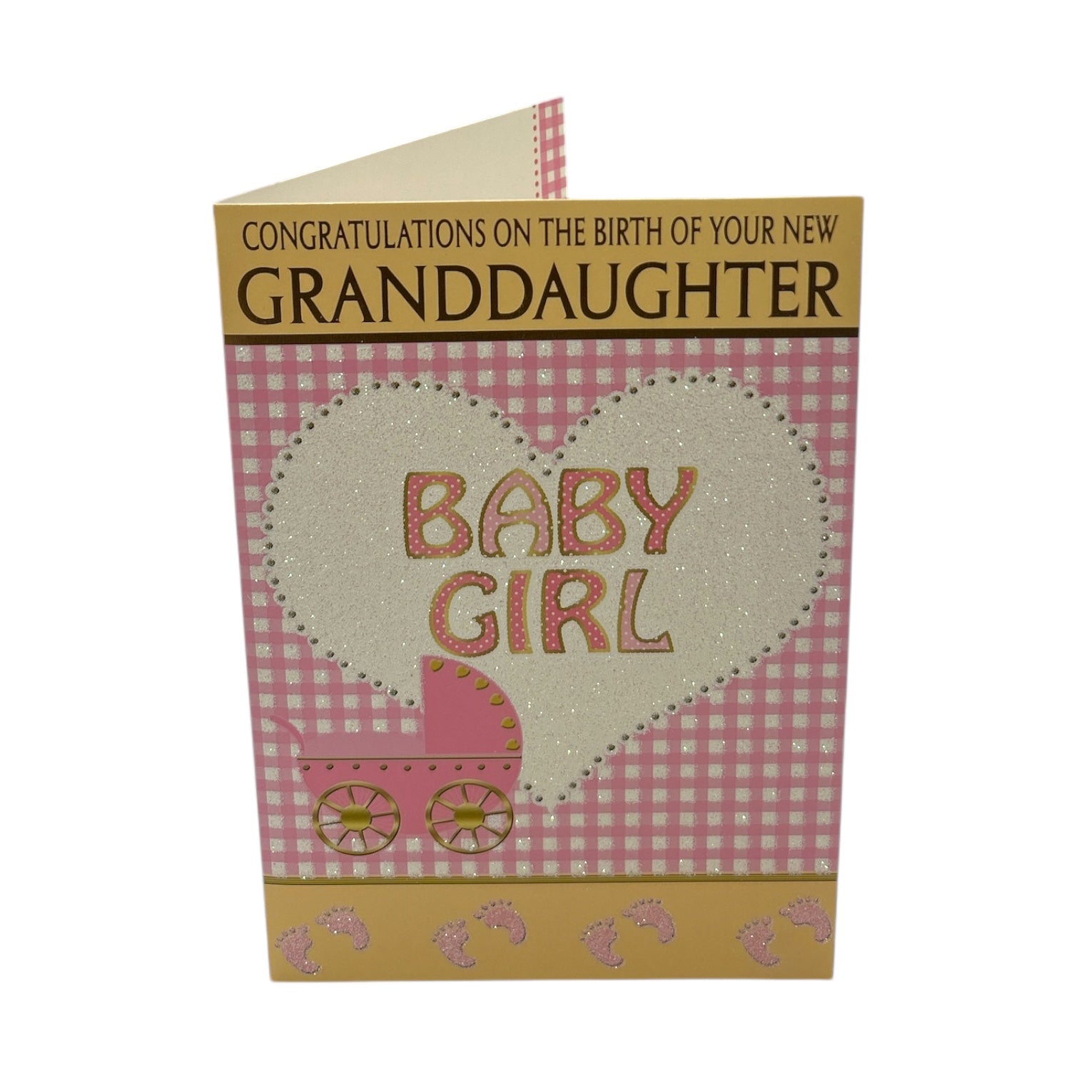 This charming pink greeting card is a beautiful way to celebrate the birth of a precious baby girl. The design features a decorative heart shape at the center, elegantly displaying the words "Baby Girl" in gold lettering, adding a touch of warmth and sophistication. The background is adorned with a pink and white gingham pattern, creating a classic and visually appealing aesthetic. Below the heart, a small pink baby pram is delicately placed in the lower-middle section, reinforcing the sweet baby theme. The pink and white color scheme is consistently carried throughout the design, ensuring a soft and cohesive look. At the bottom, the heartfelt message, "Congratulations on the birth of your new Granddaughter," is elegantly printed in gold lettering against a light pink background, making the sentiment clear and celebratory. Inside, warm congratulations wishes complete this beautifully designed keepsake, making it a perfect way to welcome the new arrival. The card comes with a coordinating envelope. Card size: Approx. 19.5 x 14 cm.