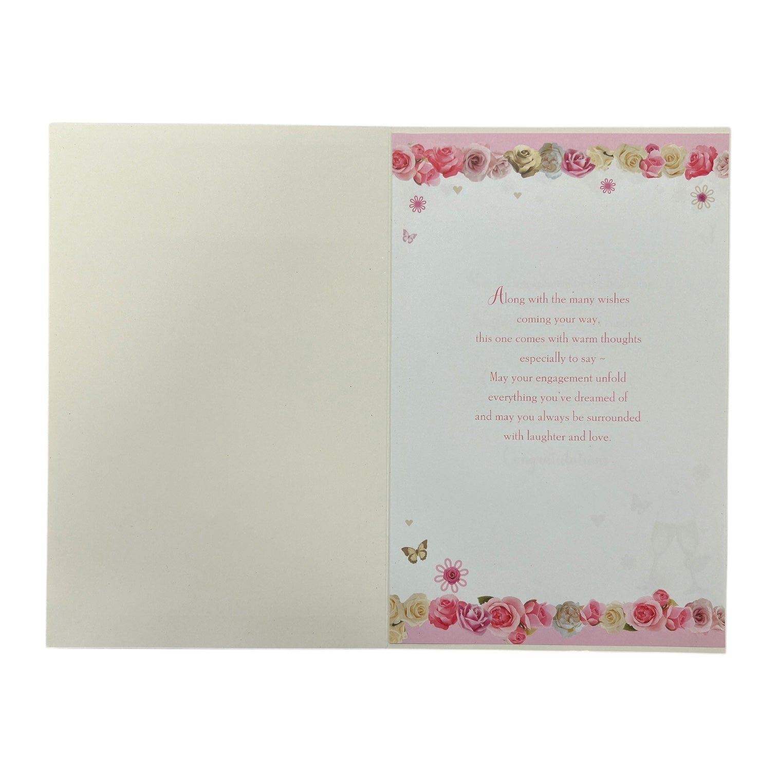 This elegant Engagement card beautifully celebrates milestone years of love and commitment. The design features a pink and cream roses in a heart-shaped design symbolizing romance and lasting devotion. Adding to its charm, silver glitter accents create a subtle shimmer, while two champagne flutes elegantly represent a joyous toast to the milestone. A light purple ribbon, tied in a delicate bow, enhances the card’s sophistication. Small hearts, butterflies, and decorative elements are scattered throughout, enriching the design with warmth and elegance. Inside, heartfelt wishes complete this beautiful keepsake, making it the perfect way to commemorate this special occasion with love and appreciation. The card comes with a coordinating envelope. Approximate size: 27.5 x 18.5.