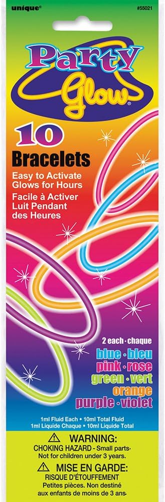 Pack of 10 8" Assorted Colors Glow Bracelets. These party accessories feature assorted color glow-in-the-dark bracelets. These bracelets are great party decorations, perfect as costume jewelry, and excellent for concerts and sports events. These bracelets are made from high-quality materials to ensure more hours of glowing light so you could enjoy your party all night without worrying they would fade away. These bracelets are made of non-toxic materials and designed for kids so that you can be relaxed knowing your kids are safe when playing with them.