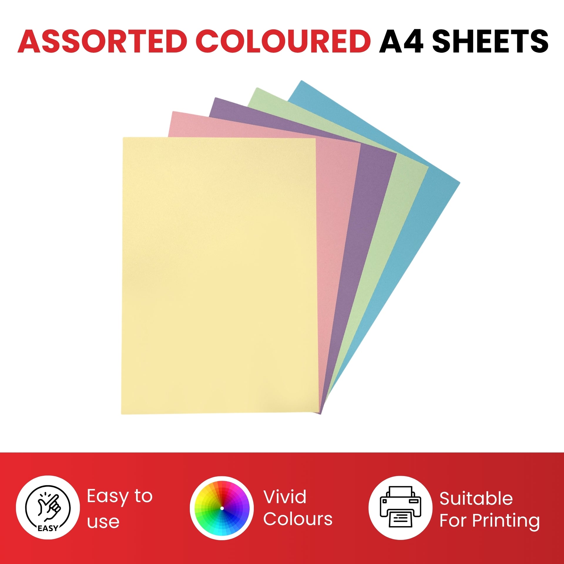 - Pack of 100 A4 Assorted Pastel Coloured Paper 75gsm Sheets