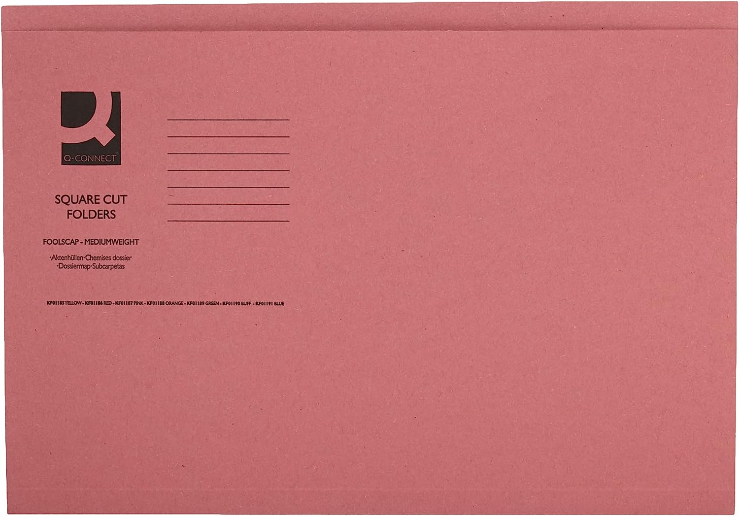 Q-Connect Square Cut Folders. Pre-creased folders manufactured from 270gsm manilla ideal for storing large quantities of paper. Features include a large labelling area and pre-punched slits to accommodate standard filing clips. Foolscap - Pink.