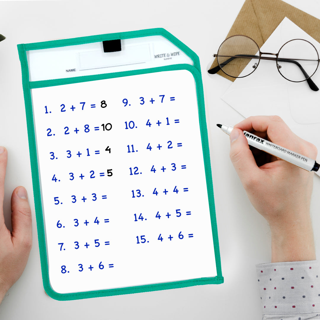 Assorted Coloured Edge Clear Dry Erase Write and Wipe Reusable Sleeve Pocket. Colours included: Red, Green, Blue, Orange. These help save on paper in the classroom or workplace. Great teaching supplies and classroom resources. Take notes and memos using a dry wipe marker. Easily remove and reuse when finished. Keeps documents safe and secure. Size: 255 x 375mm. Ideal for A4 Paper. 300 Micro Thickness.