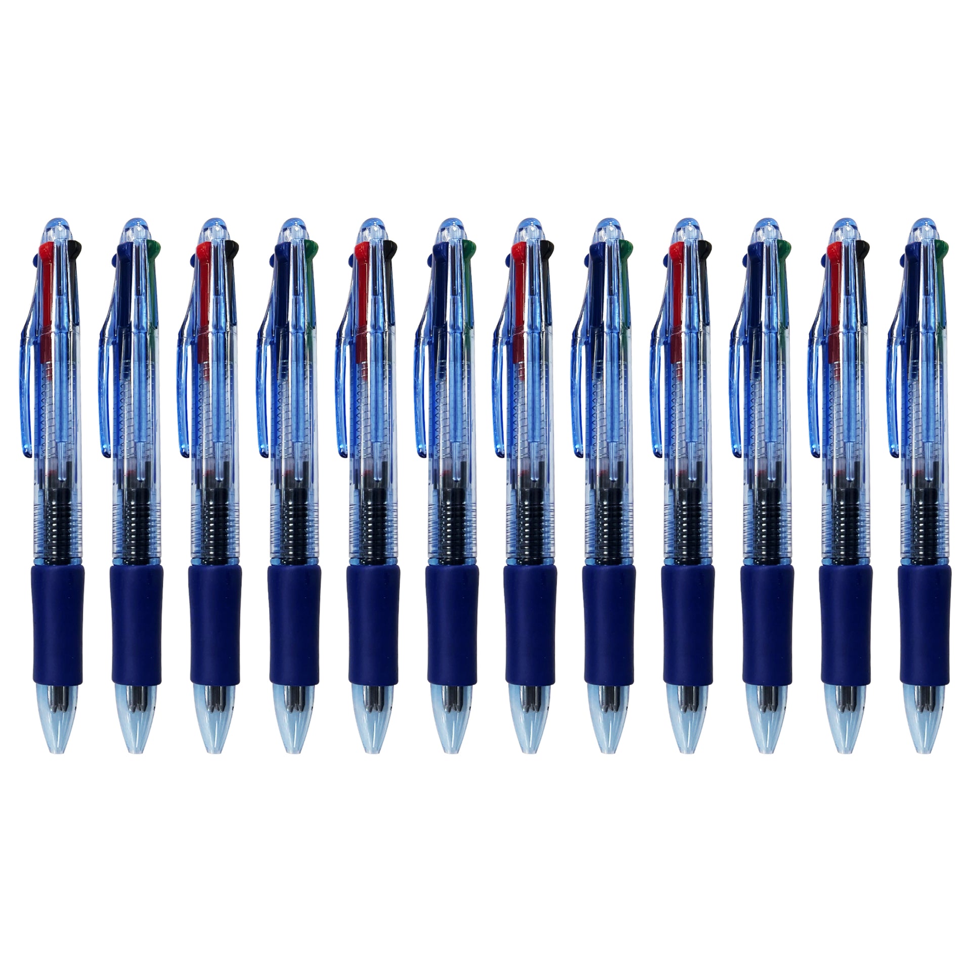 Pack of 12 4 Colour Ballpoint Pens by Janrax. Change ink colour at the push of a button with this retractable 4 Colour Ball Point Pen. Choose between black, blue, red and green ink for a multitude of writing tasks. Ergonomic barrel with a rubber grip for comfort. 1.0mm nibs writes a 0.5mm line width.The ball point nibs provide a smooth writing experience and the retractable design prevents the ink drying out.