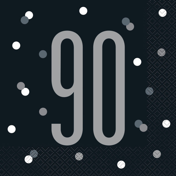 Pack of 16 Birthday Black & Silver Glitz Number 90 Luncheon Napkins. Put the finishing touch on your party table setting with these luncheon napkins. These napkins feature a number "90" text and dots design in black background. Make cleanup a breeze with disposable paper napkins.