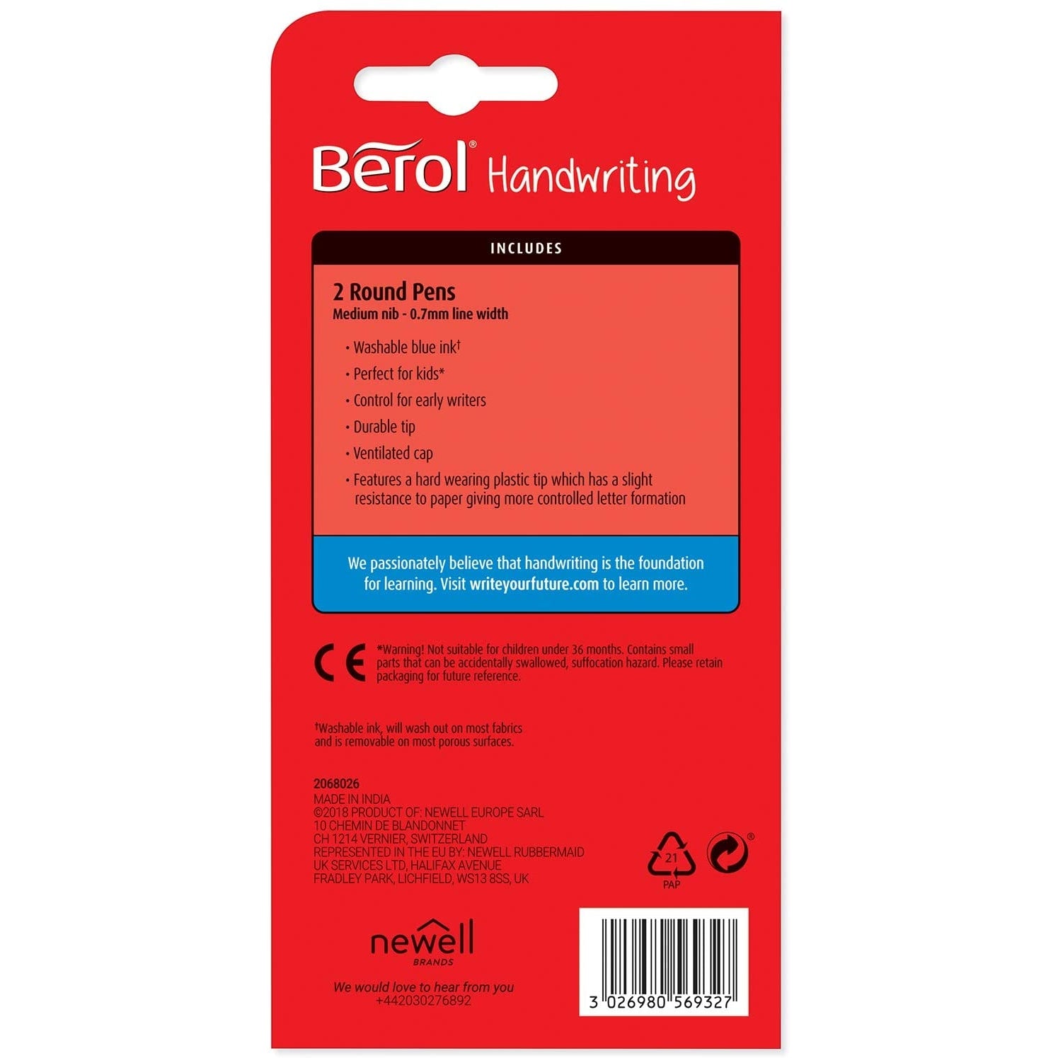 Pack of 2 Berol Blue Handwriting Pens. Medium Nib - 0.7mm line Width. Ideal for kids to practice and write them from the start. Control to help early writers learn. Durable tip and bold washable blue ink for clearly visible marks on the page. Thick round shape makes the handwriting pens easy to hold. Bright barrel colours make handwriting more fun.