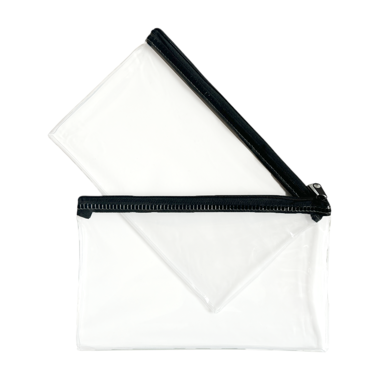 Pack of 2 Janrax 8x5" Black Zip Clear Exam Pencil Cases. These clear pencil cases are ideal for exams and everyday school use. Made from durable 200-micron PVC, the transparent body allows easy visibility of contents and complies with most exam regulations. Each case features a strong zip closure, perfect for securely storing pens, pencils, erasers, and other stationery. Available sizes: 8x5" and 13x5". Available zip colours: Black, Blue, Green, Red, Yellow, White, Pink, Purple.