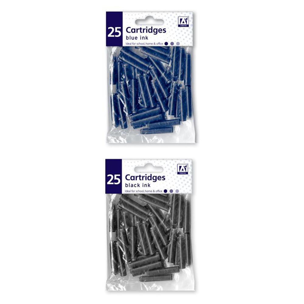 Pack of 25 Fountain Pen Blue Ink Cartridges. Quality pack of blue ink cartridges for fountain pens. Standard Size. Ideal for school, home & office.