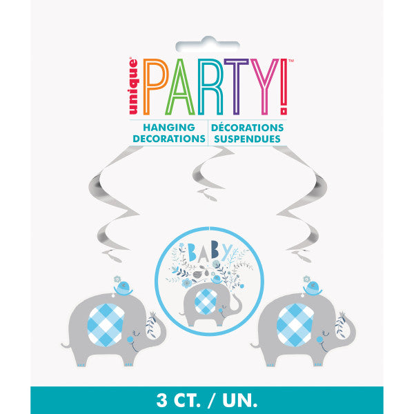 Pack of 3 26" Blue Floral Elephant Hanging Swirl Decorations. These hanging decorations feature circular cutouts printed with an elephant and a "Baby" shower headline. These hanging decorations are perfect for your baby shower party. These hanging decorations are made of durable and recyclable paper. Pop these up on the ceiling and transform your house into a party atmosphere instantly.
