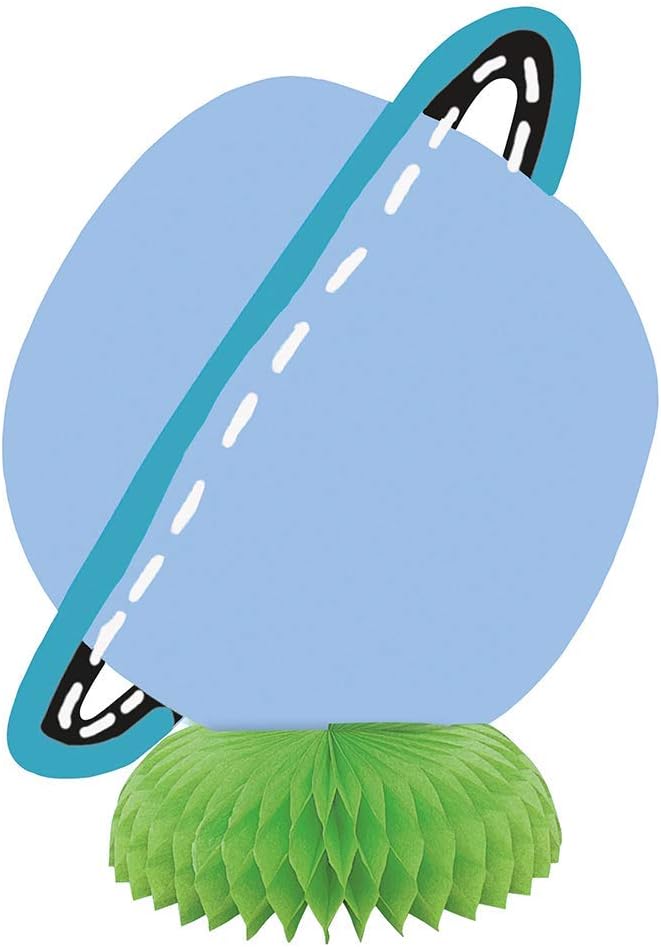 Pack of 3 Assorted Outer Space Centerpiece Decorations. These centerpieces feature a rocket and planets attached to green, yellow, and blue honeycomb stands. These are the perfect centerpieces to use on your birthday party table. These centerpieces are made of durable materials.