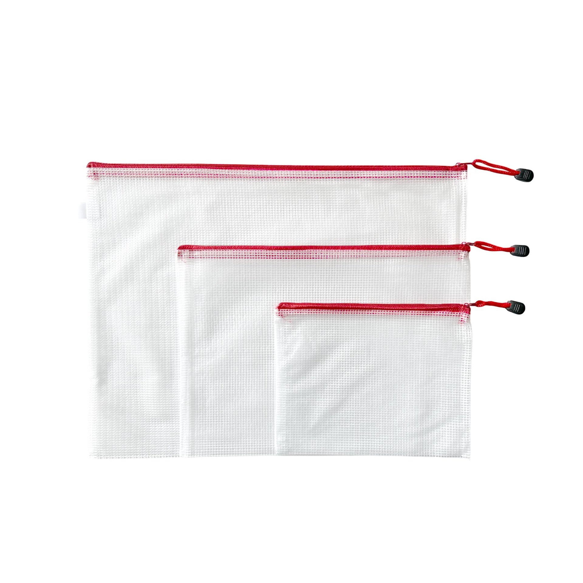 Pack of 3 Red Zip Assorted Sizes Strong Mesh Bags by Janrax. Size: A3, A4, A5. Zip Colours: Red. Transparent strong mesh reinforced bag with coloured zip. Zip cord for easy opening. 250 Micron. Ideal cases for storing and protecting documents and products. Range of colours from the Janrax range.