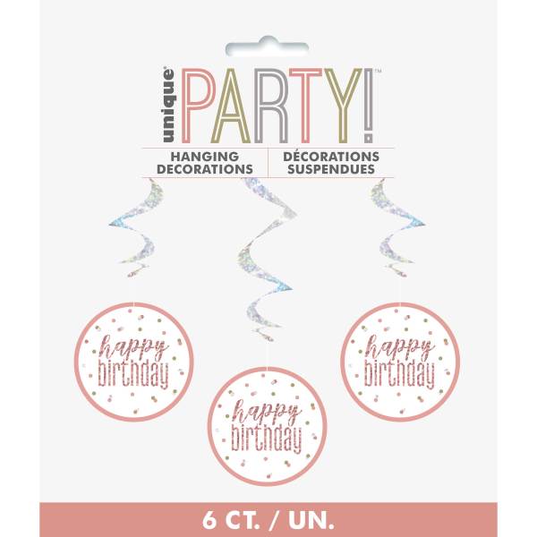 Pack of 6 32" Glitz Rose Gold Hanging Swirls "Happy Birthday". Perfect addition to your birthday decoration spicing up your venue. These hanging sworls are made of foil and are durable enough to be used many times in different party occasions.