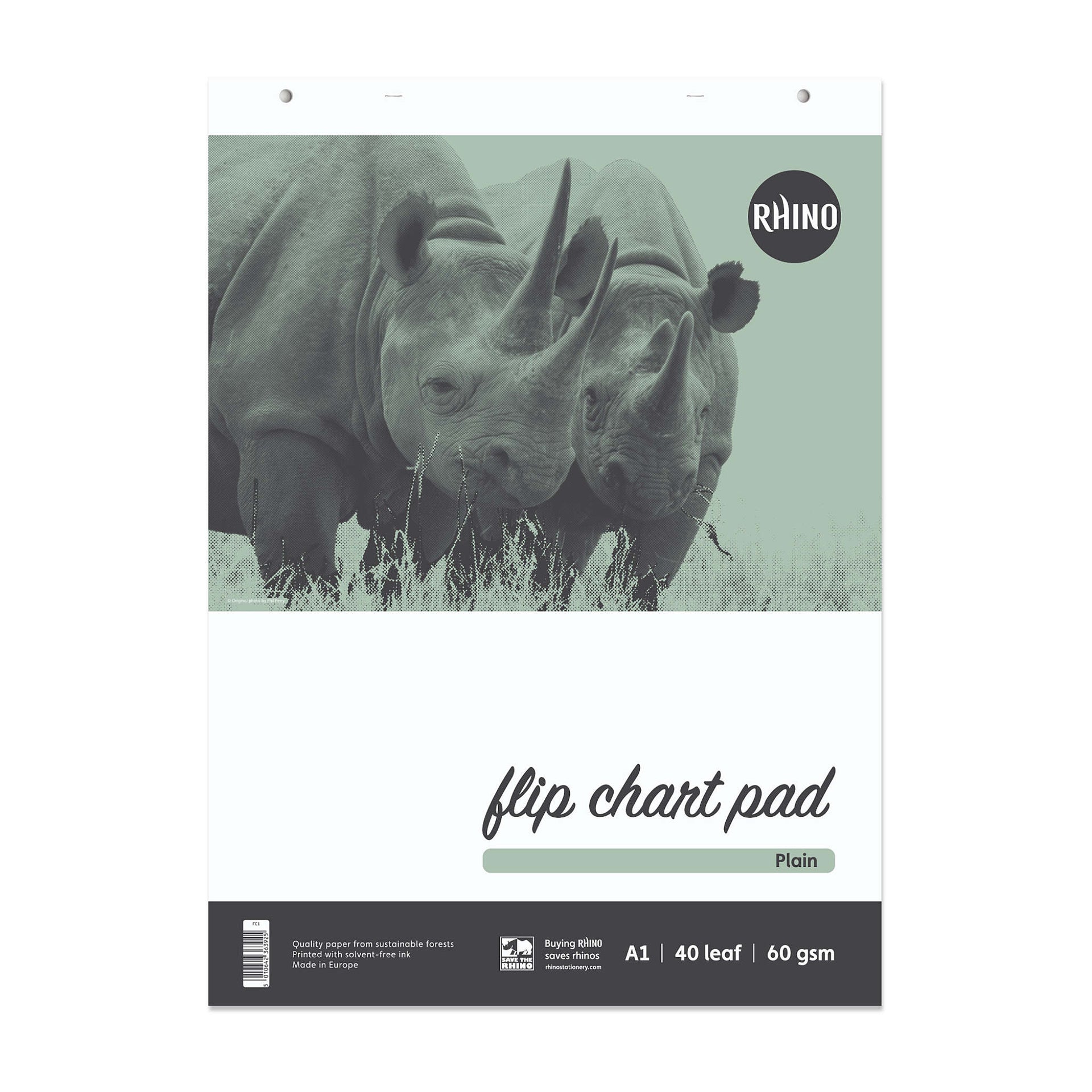 Great quality A1 pad (approx. 800 x 580 mm) with 80 pages of easel paper, each plain unruled. These flip chart pads are ideal for doing presentations. RHINO A1 Flip Chart Pad 40 Leaf, B. A1 (approx. 800 x 580mm). Blank pages. Intelligently intelligible our premium matte paper guarantees exceptional readability. 80 pages. Help Save the Rhino with our regular donations to the UK charity over 100,000 since 2006. Market-leading RHINO brand. 100% recyclable. Printed using solvent-free, water-based inks. Paper sourced from sustainable European forests. Made in EU.