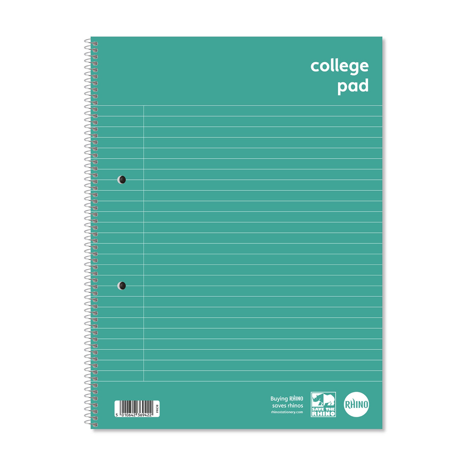 RHINO College Pad A4+ with 140 pages each ruled with 8mm lines and a margin. This notebook can be used as a refill pad, journal, organiser or for everyday notetaking in class, it is designed to keep your important notes safe and secure. Part of your university, school or college stationery essentials. RHINO College Pad A4+ (296 x 220mm approx.) 70 Leaf / 140 Pages. Extra- durable, stylish spot-varnished green front cover. Micro-perforation and pre-punched education standard 70 gsm white paper, you can write on both sides with a quick and neat tear-out to put in your folder or binder. Sturdy, simple spiral binding along the side. Durable coated cardboard back cover. 100% recyclable. Printed using solvent-free, water-based inks. Made in EU.