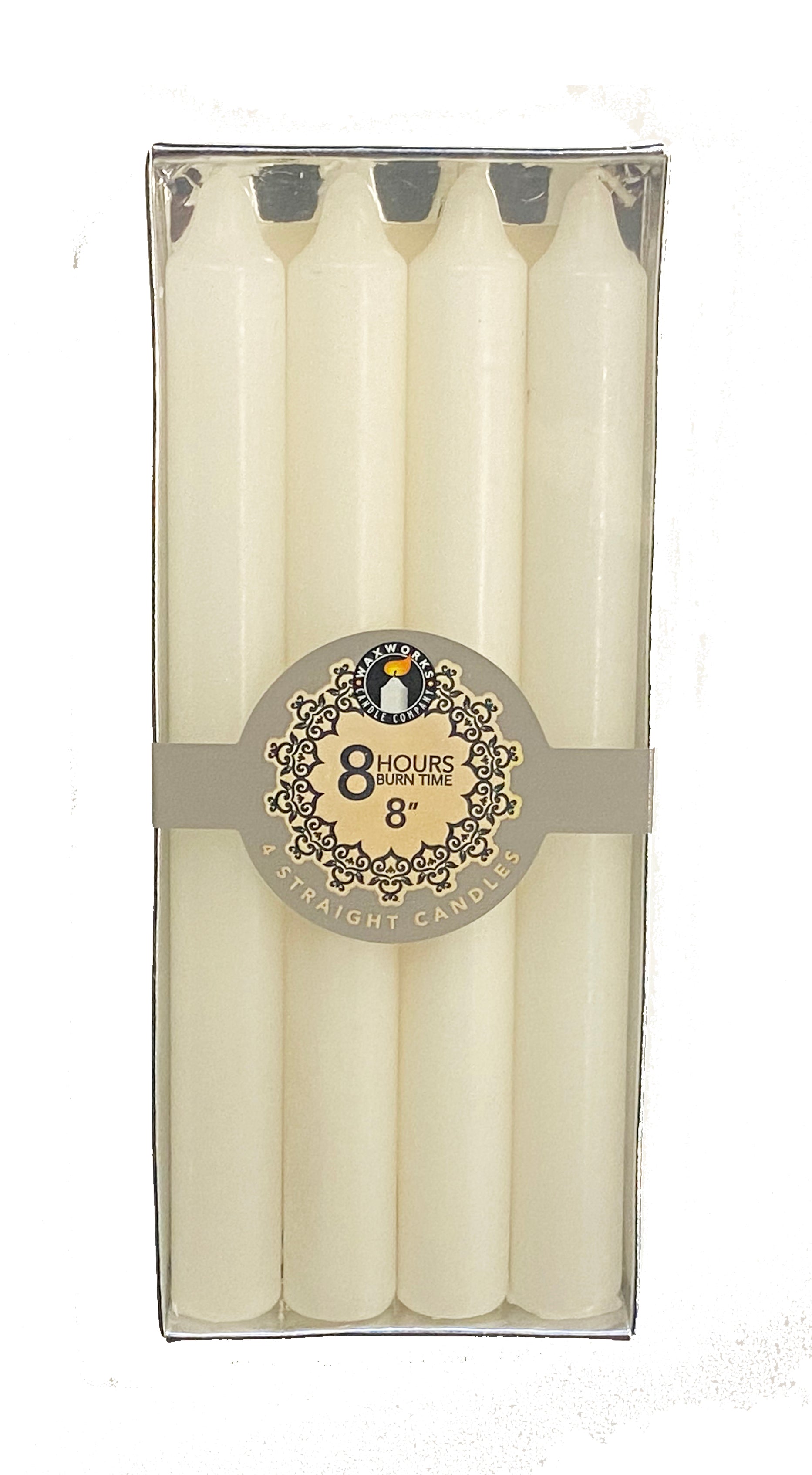 - Set Of 4 8'' Straight White Candles - 8 Hours Burn Time