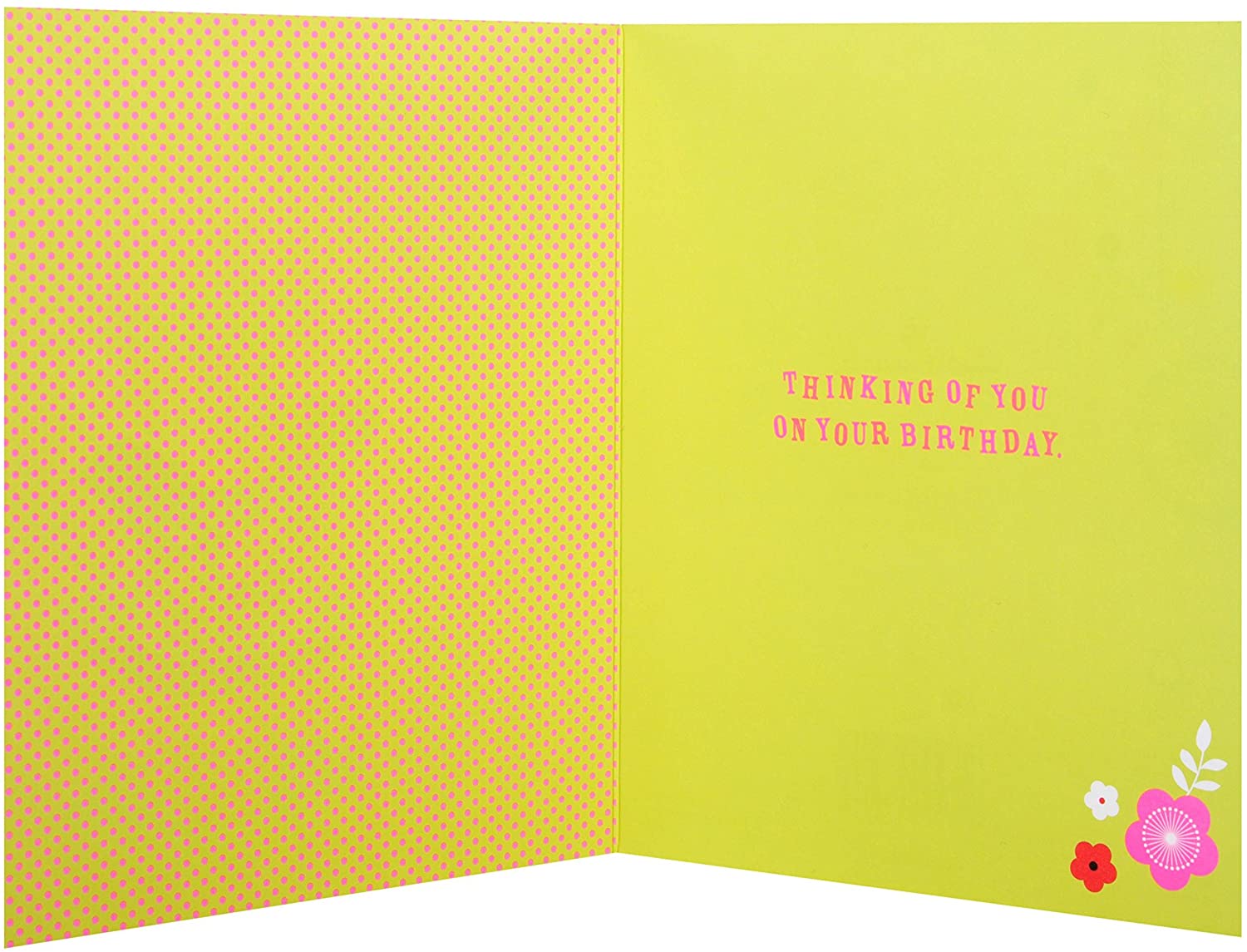 Simple Pleasures Neon Birthday Card Cups and Saucers Design. Message inside card reads: 'Thinking of you on your birthday'. Finish: Glitter. Size: 167 x 140mm. Envelope: White. Wish someone a happy Birthday with this bold and colourful card.
