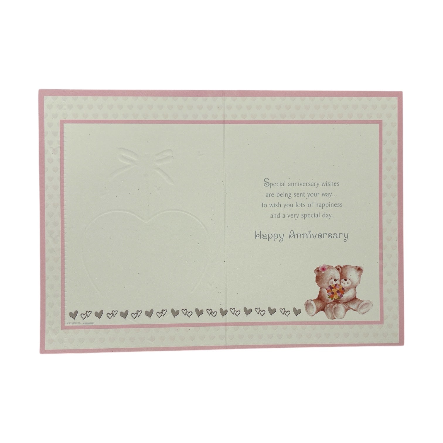 This charming anniversary card celebrates a Sister & Brother-in-Law's special day with warmth and affection. At its center, two adorable teddy bears embrace within a rich purple heart shape, symbolizing love and togetherness. The bears hold champagne flutes, adding a celebratory touch to the design. The heart is suspended from a delicate silver bow, elegantly adorned with small yellow flowers, enhancing its whimsical appeal. The background is a soft light beige, gently decorated with scattered small hearts for a romantic and heartfelt feel. Along the vertical edges, a decorative border featuring small flowers and hearts in shades of purple and beige adds a refined finishing touch. Inside, thoughtful anniversary wishes complete this beautifully designed card, making it a perfect keepsake for the happy couple. The card comes with a coordinating envelope. Card size: Approx. 19.5 x 14 cm.