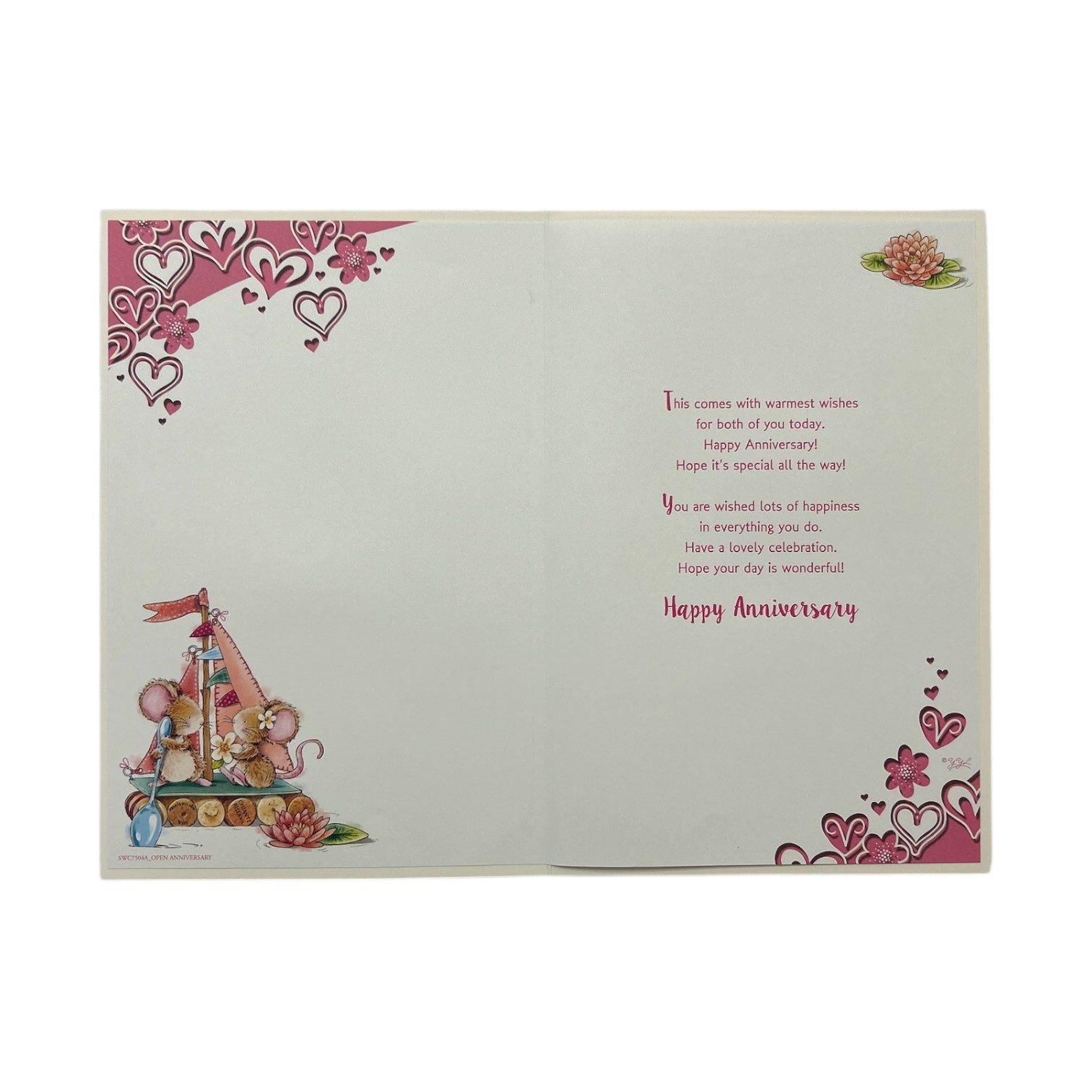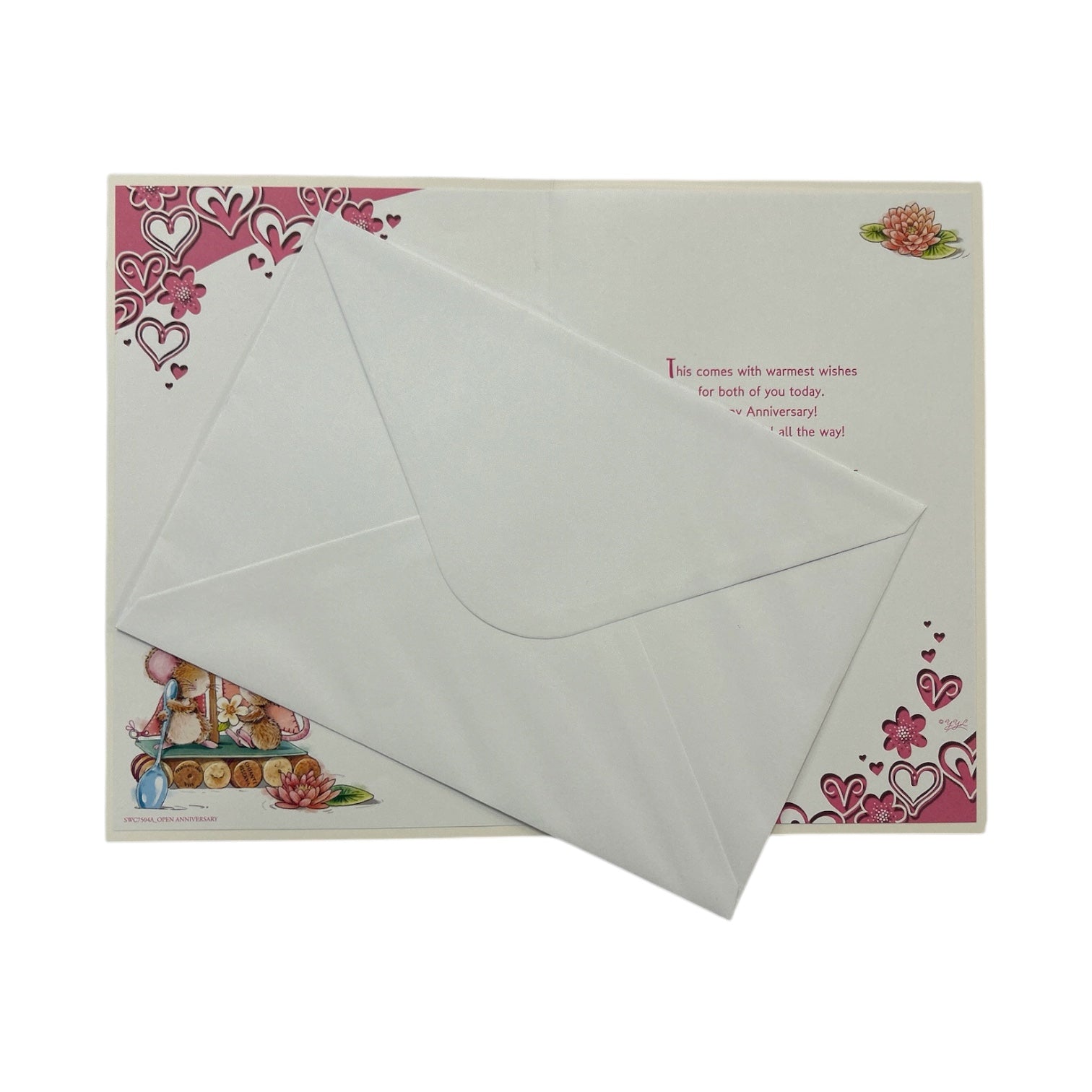 Celebrate the love and togetherness of a wonderful couple with this heartfelt Anniversary Card. The front design showcases an adorable illustration of a lovely mouse couple sailing on a beautifully decorated pink yacht, symbolizing their shared journey of love and happiness. Embossed bursts of hearts and shimmering foil details add an elegant and romantic touch, making this card truly special. Inside, a warm and lovely anniversary wishes message expresses your joy and best wishes for their continued happiness. This card is the perfect way to celebrate their special day. The card comes with a coordinating envelope. Card Size: Approx. 19.5 x 14 cm.